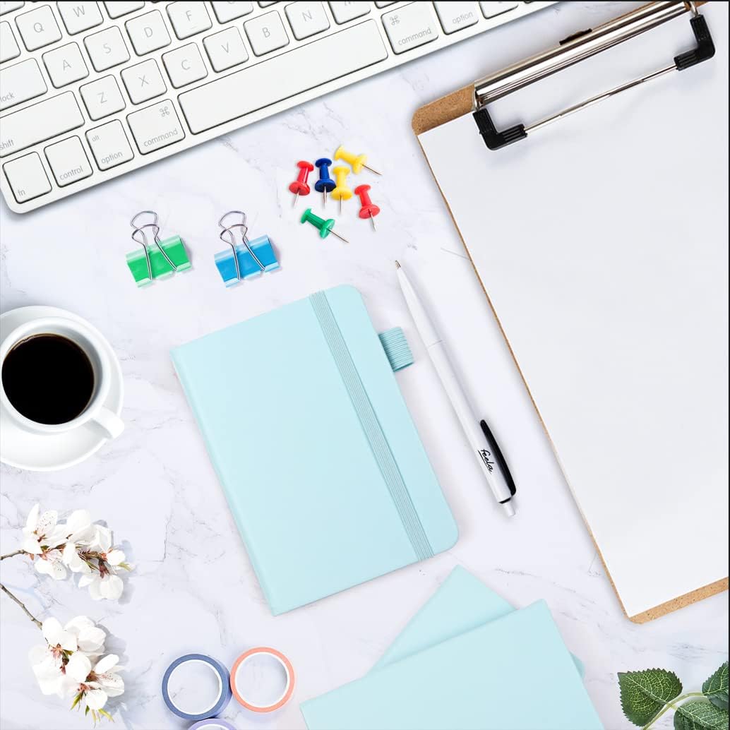 feela 6 Pack Pocket Small Notebooks Bulk, Mini Cute Memo Notepads Hardcover College Ruled Lined Journals with Pen Holder for Women Girls Office School, with 6 Black Pens, 3.5”x 5.5”, A6, Sky Blue