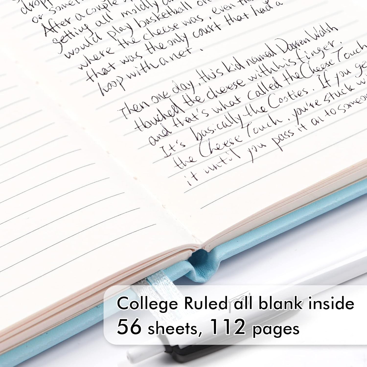 - These college ruled notebooks are all blank inside with 112 lined pages (56 sheets), which would be convenient for daily usage. The hard cover journal has a water-resistant faux leather cover, round corners and bookmarks, which is designed to lay and open flat. There’s a “date/page” column on the top of every page. You can use it as a reminder to let you remember those important dates and find the page you want in a very short time.