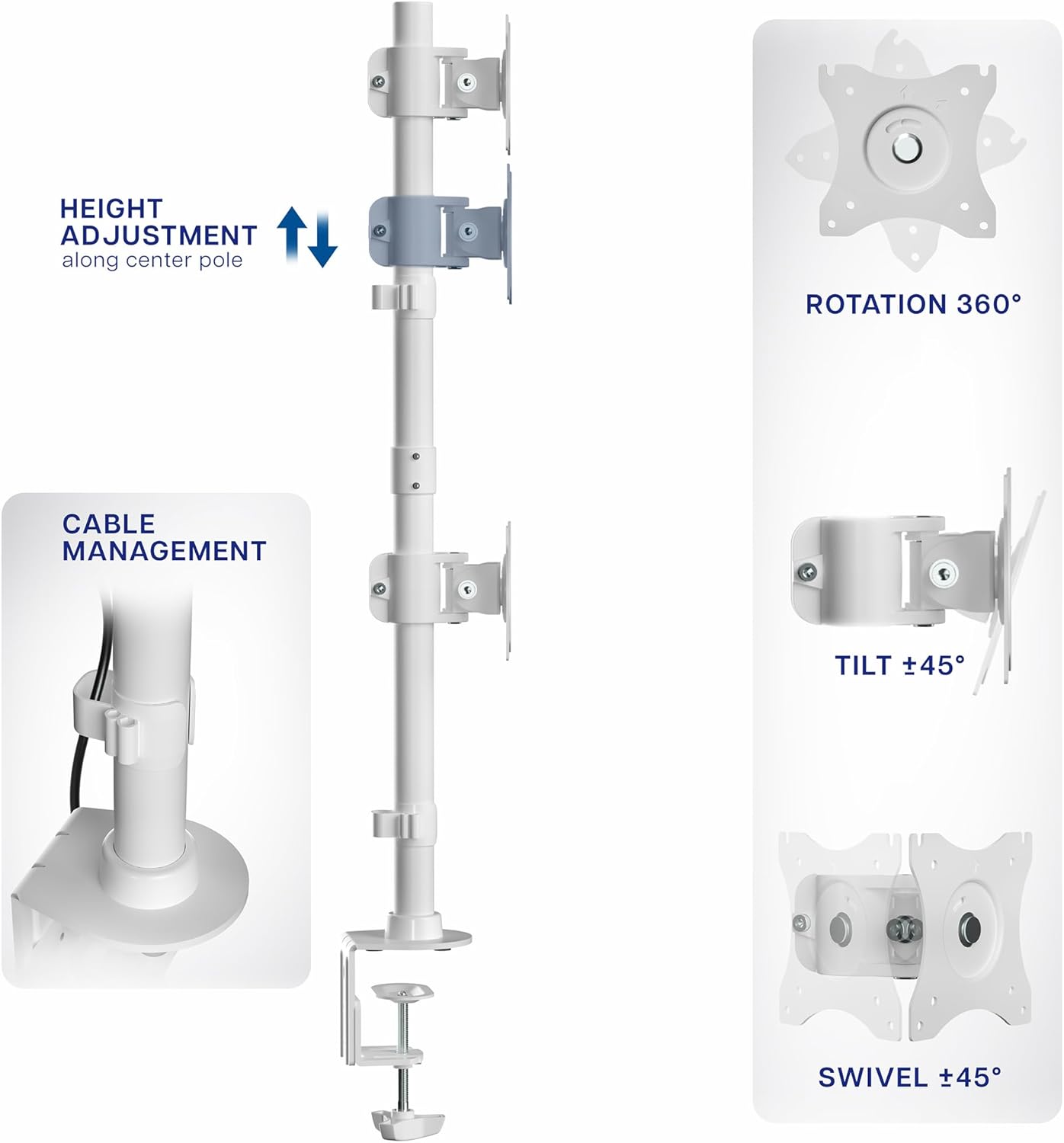- Articulation and Height Adjustment: Adjustable mounting brackets offer +45° to -45° tilt, 90° swivel, 360° rotation, and height adjustment along the center pole. Monitors can be placed in portrait or landscape orientation