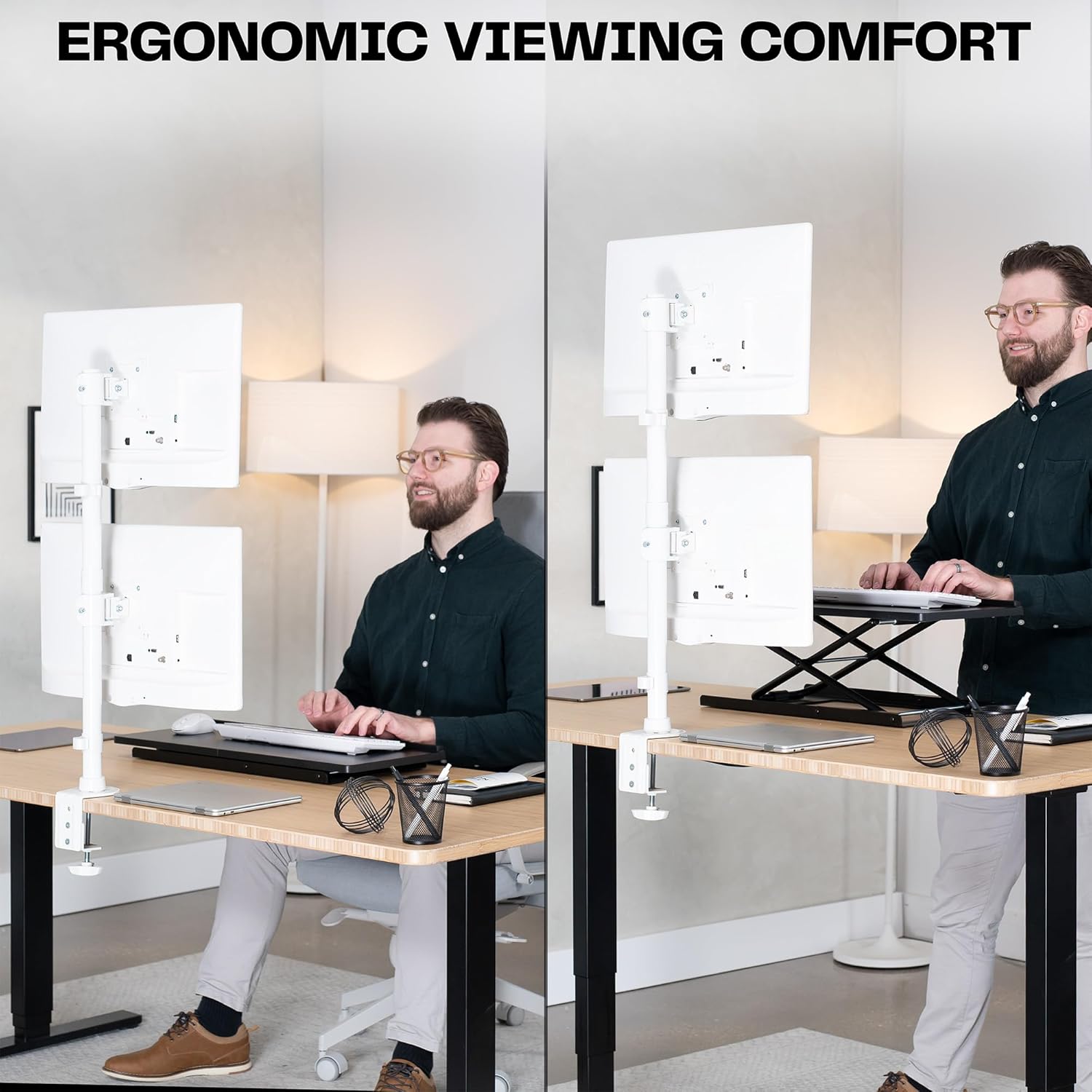 - Ultrawide Compatibility: Dual vertically stacked monitor mount fitting two ultra-wide screens 13” to 34” in size and up to 22 lbs in weight (each) with VESA 75x75mm or 100x100mm mounting holes