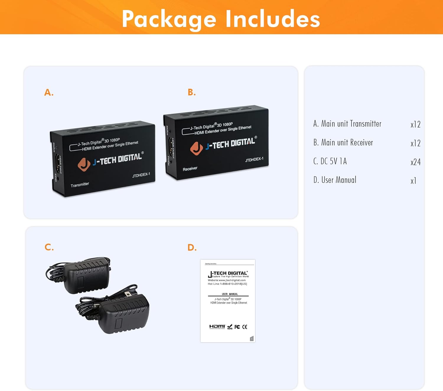 ![J-Tech Digital HDMI Extender 1080P 60Hz Over Single CAT 5e/6 Up to 200ft. | Deep Color, EDID Copy, Zero Signal Loss | Pack of 12 [JTDHDEX-1]](http://supplihaus.com/cdn/shop/files/61rZ5f-VMfL._AC_SL1500.jpg?v=1762331416&width=1445)