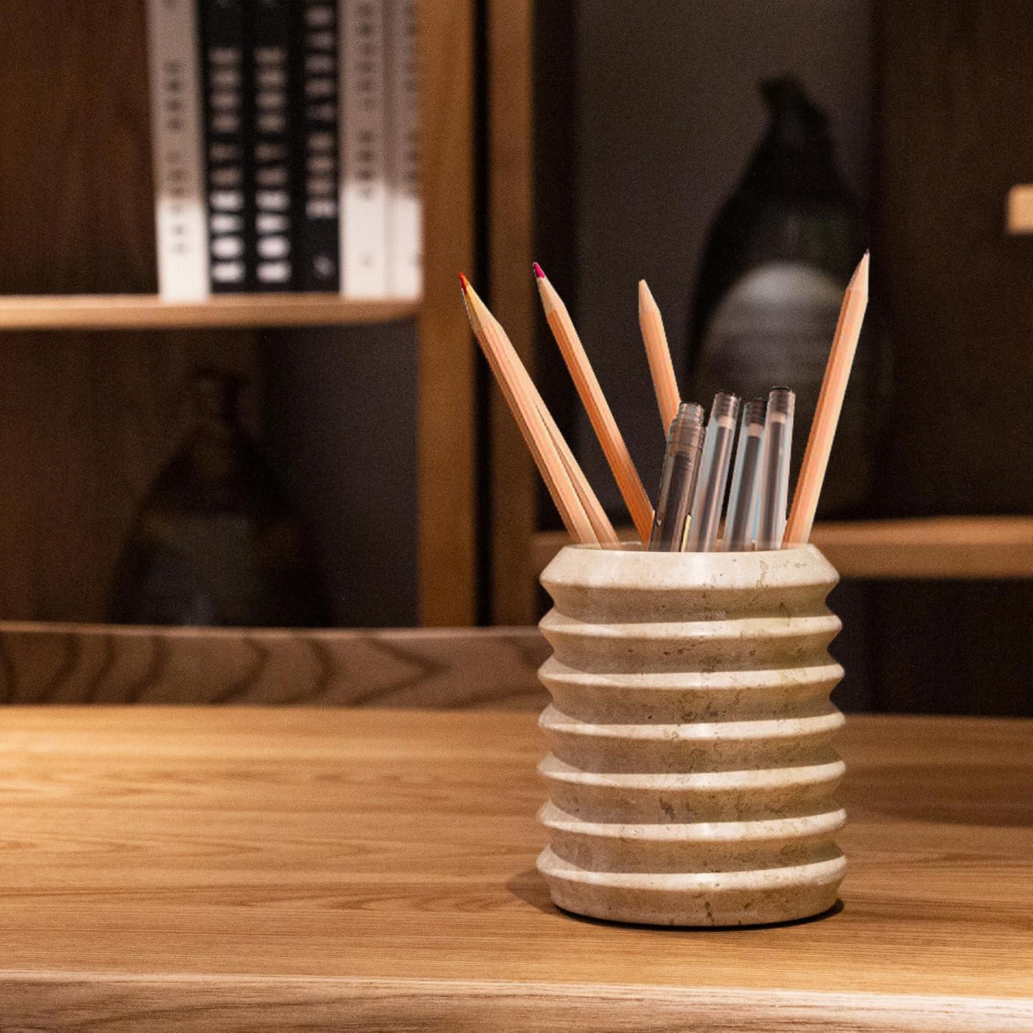 WORHE Pen Holder Stand for Desk, Natural Travertine Stone Makeup Brush Holders, Modern and Functional Pencil Cup for Office Supplies Tableware Organizer for Home Decor School Beige (PH90110)