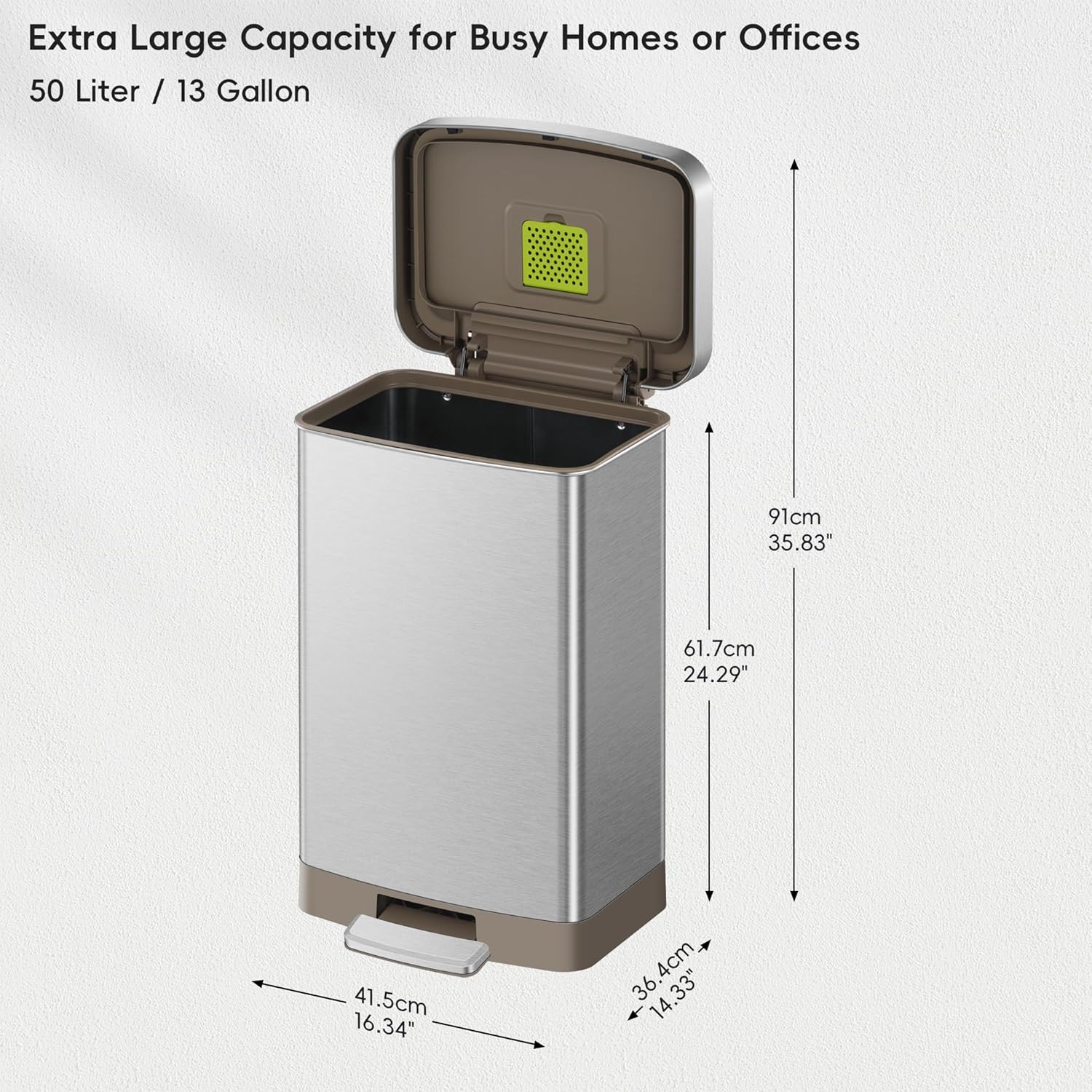 - Superior Stainless Steel Build - This heavy-duty 13 gallon trash can boasts an ultimate fingerprint-resistant stainless steel construction that provides a versatile and stylish waste disposal solution to your home, office or other spaces.