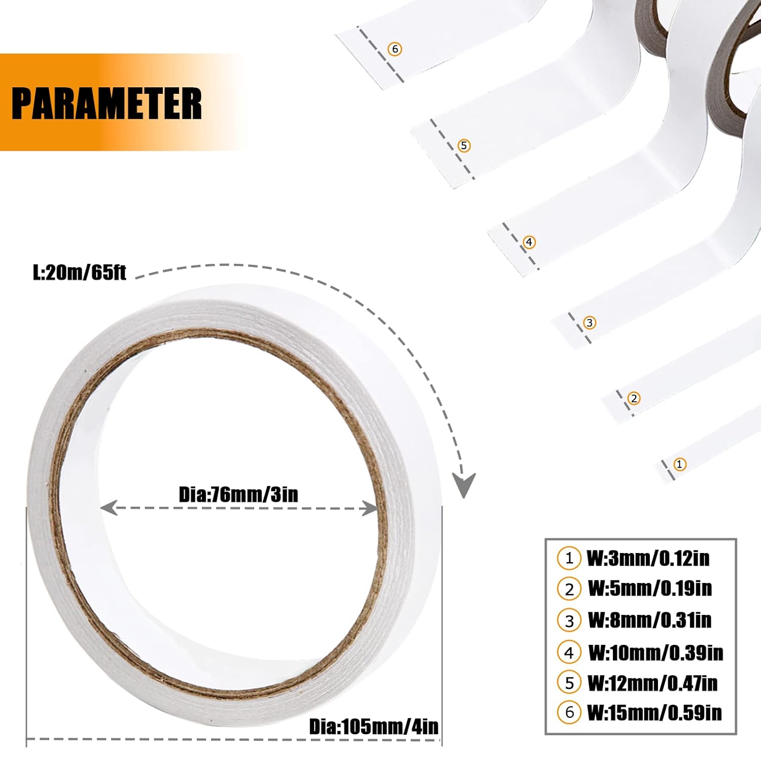 - What You Get? You will get 6 specifications of the double sided craft tape: 0.12in X 65ft double sided fabric tape rolls *1pcs, 0.19in X 65ft paper tape *1pcs, 0.31in X 65 ft 2 sided tape(artist tape) *1pcs, 0.39in X 65ft scrapbooking tape roll *1pcs, 0.47in X 65ft double stick tape for crafts *1pcs, 0.59in X 65ft craft double sided tape heavy duty *1pcs. And if you have any questions about our such double-sided tape, welcome to left us messsage any time any day. We are here for you, 24 hours 7 days!