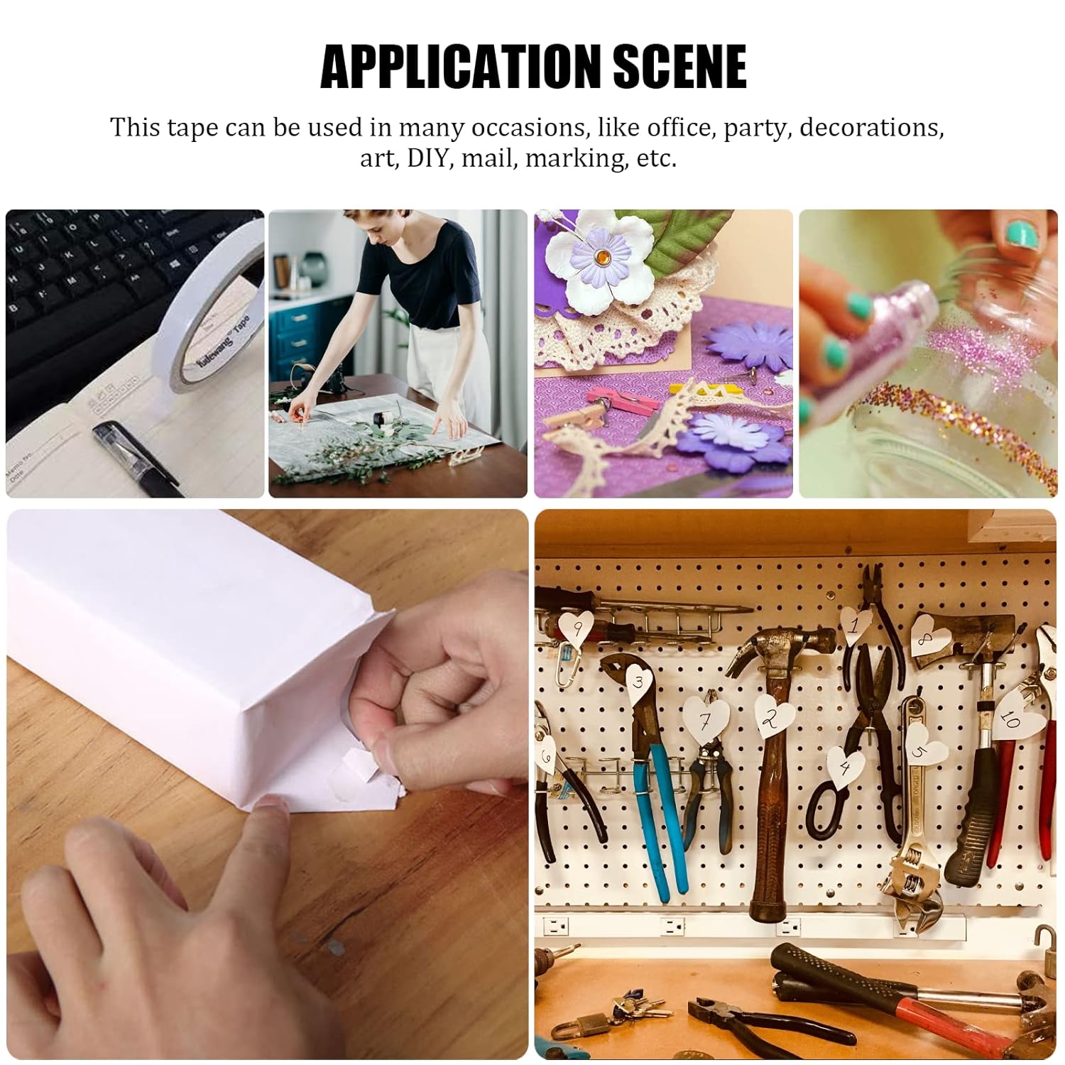 - Strong Adhesion: Double face tape adopts high quality adhesive, so this double side tape has stronger viscosity than normal tape. By using extra strong double sided tape craft roll, you can stick two items (e.g., paper) together firmly. Sticky tape can stick tightly to various surface, like glass, fabric, metal, tile, wood, paper, plastic, marble, leather, wall, balloon, especially for paper. Note: for better effect, please keep the object surface clean and smooth before stick on.