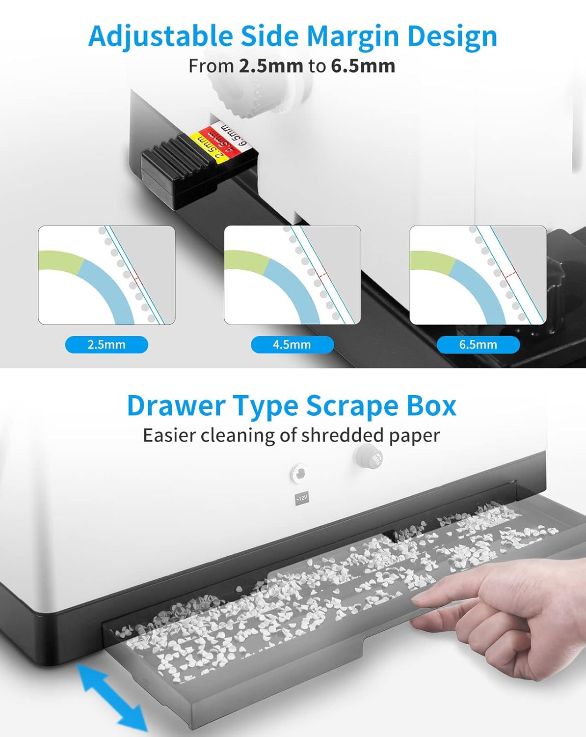 - 【ADJUSTABLE MARGIN】With adjustable side and edge guide, this machine also ensures a precise alignment with each document your bind, and you can easily customize the paper margin: 2.5mm, 4.5mm, 6.5mm to create professional-looking works