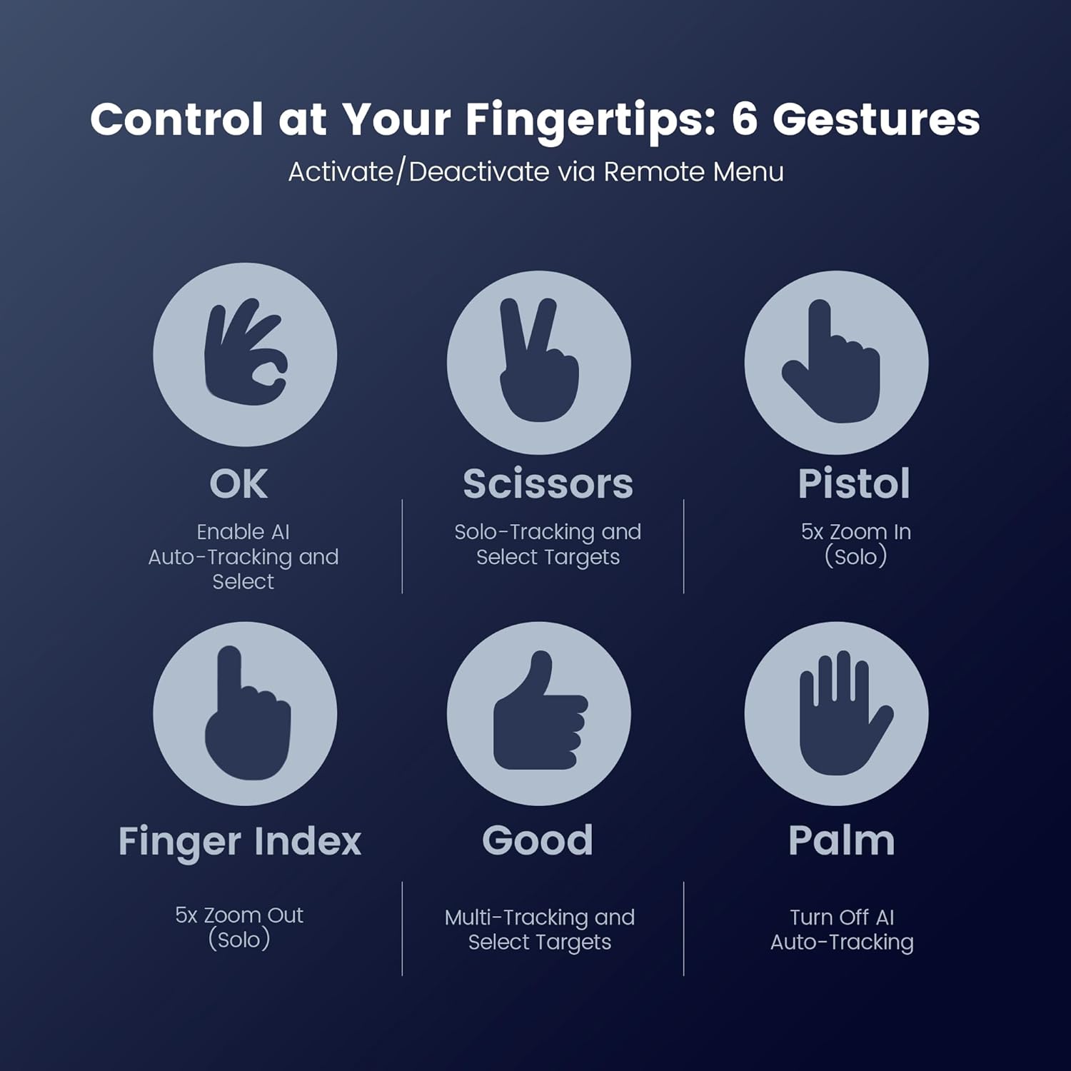 - 【Auto-Tracking with Gesture/Remote Control】Gestures enable AI auto-tracking and 5X digital zoom: 👌'OK' to AI-tracking ON and enter multi-human tracking, ✌'V' to enter solo-tracking, 👉'L' to zoom-in(in solo-tracking), ☝'One' to zoom-out(in solo-tracking),👍'Good' to enter multi-human tracking, ✋'Palm' to AI-tracking OFF. AI Function Upgrade: The Gesture function can be ON/OFF in the Menu and Auto-tracking can also be ON/OFF by the remote control.