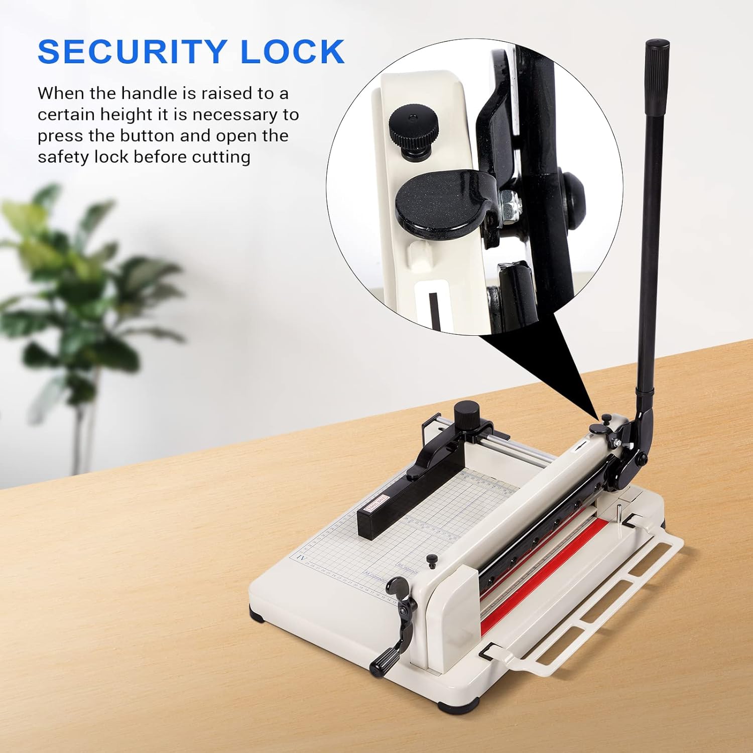 • ★【Security Lock & Cradle】:The security lock on the paper cutter for cardstock can reduce operators' harm by accidents. The multifunctional bracket can support the right part of papers, which makes the paper cutting more convenient.