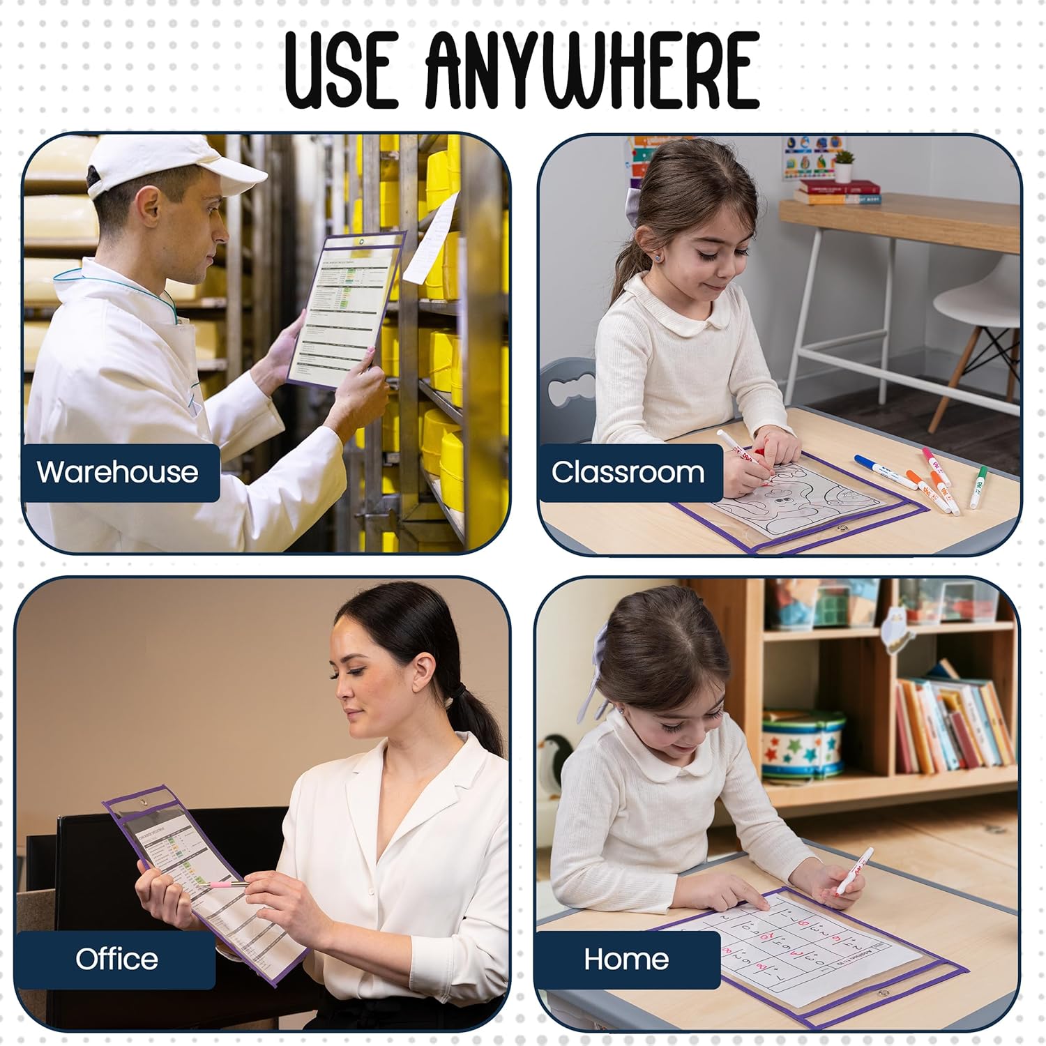 - Reusable - With their dry erase surface, the clear document sleeves are completely reusable. Simply insert the sheet and endlessly write on the front of the ticket holder and erase it when no longer needed.