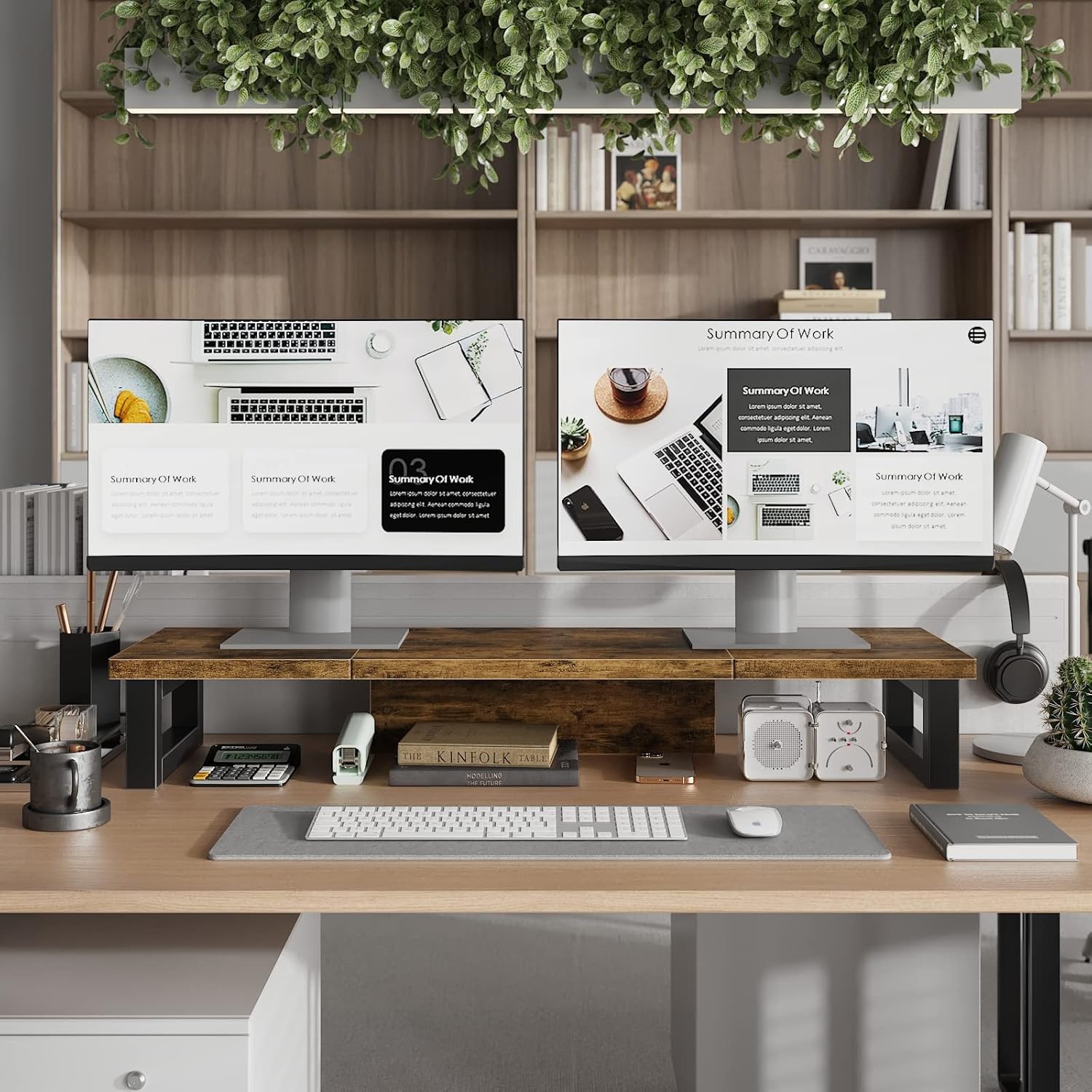 WESTREE Dual Monitor Stand Riser, Wood and Steel Monitor Stand Riser, Computer Monitor Stand for 2 Monitors, Multi-Purpose Desktop Storage Stand for Computer,Laptop,Printer,TV