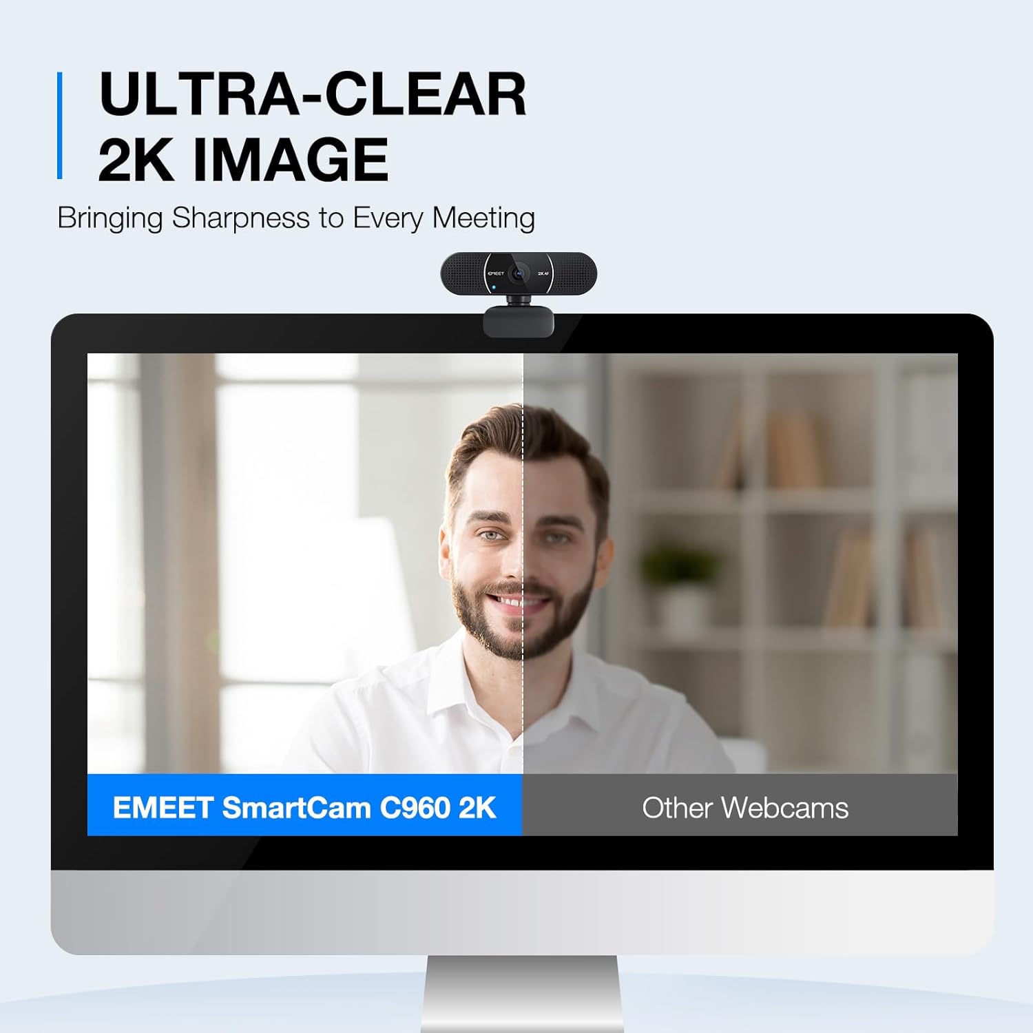 EMEET C960 2K Webcam with Microphone, 2K QHD, 2 Noise-Reduction Mics, TOF Autofocus Streaming Webcam with Privacy Cover, Plug&Play USB Webcam for Calls/Conference, Zoom/Skype/YouTube, Laptop/Desktop