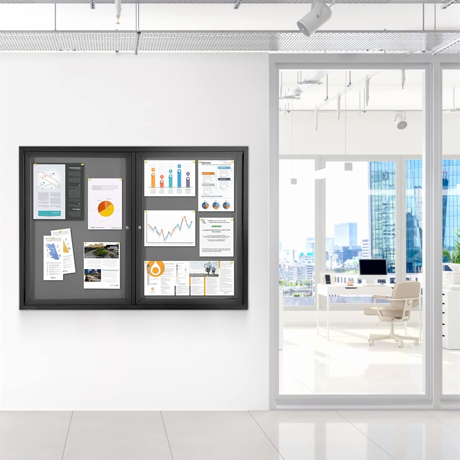 Enclosed Bulletin Board Outdoor Noticeboard with Locking Door, Weather-Resistant, Grey Felt, Black Aluminum Frame, 48 x 34 in