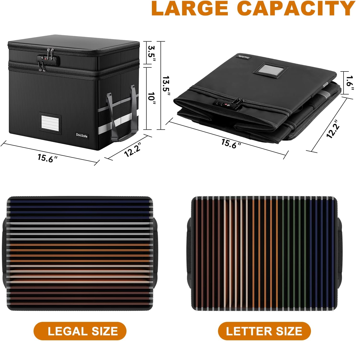 DocSafe File Box with Lock,Multi-Layer Fireproof Document Box Collapsible File Storage Organizer with Pockets/Handle,Large Portable Home Office Filing Safe for Hanging Letter/Legal Size Folders,Black