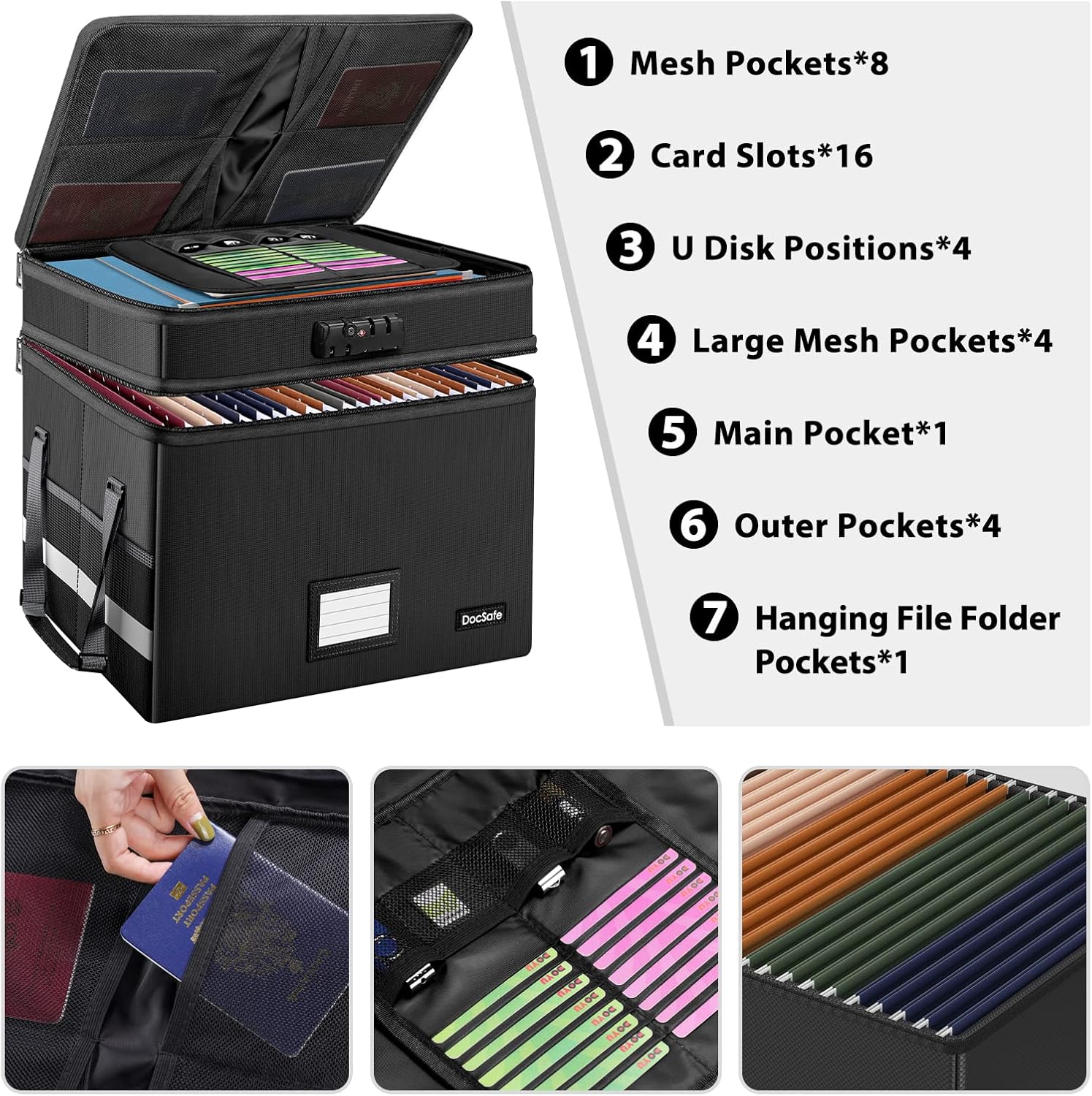 - Multi-Layer&Large-capacity(16"x13.8"x12.2"): Compared with other file boxes, our fireproof file box adopts a multi-layer design that can meet all your storage needs. These include 8 passport mesh bags, 16 card slots, 4 U disk pockets, 2 mesh bags, 4 outer pockets, 1 large pocket, and one main pocket with large space. They are ideal for storing cards, passports, CDs, USB, albums,certificates and other valuables.The main pocket can fit both letter and legal-size files or anything else you want.