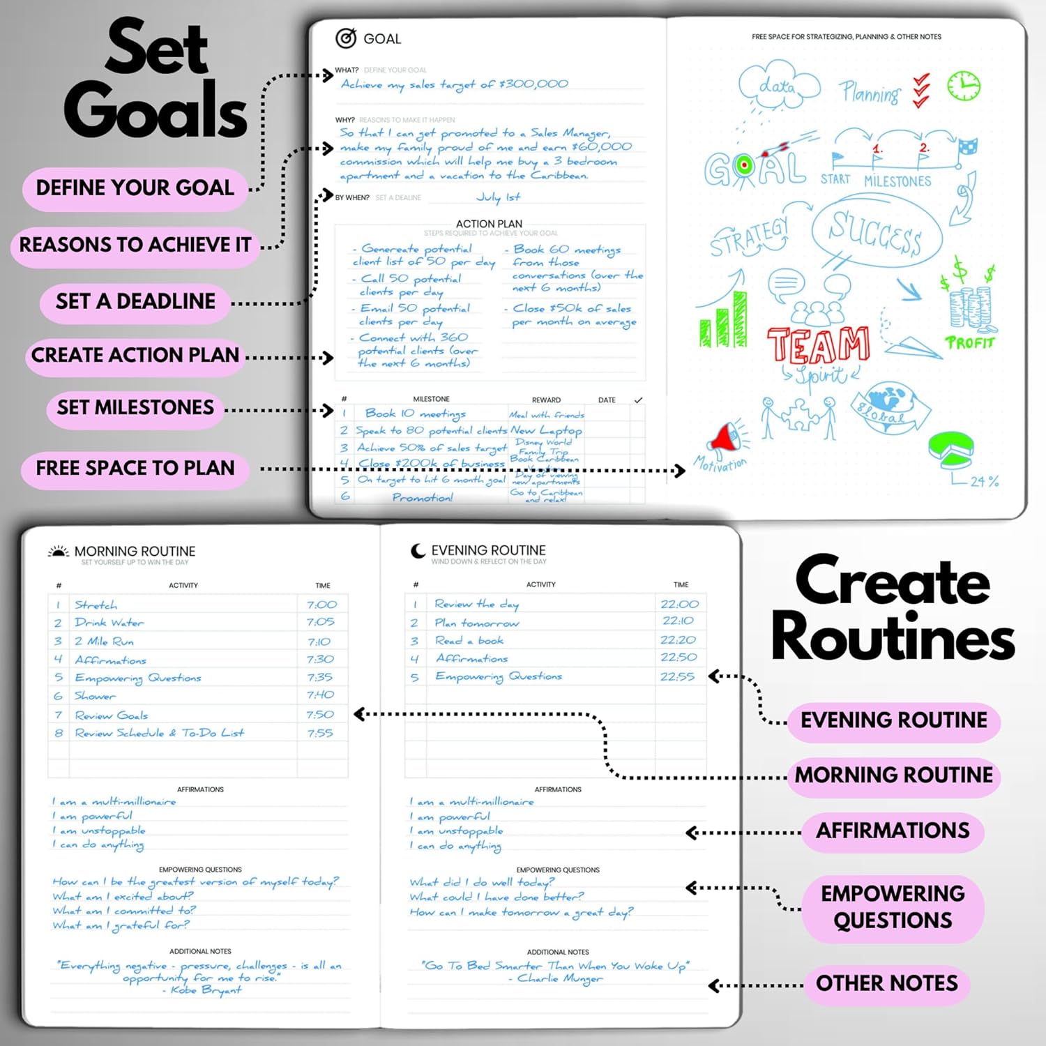 - STAY ALIGNED WITH YOUR GOALS – Use built-in goal-setting tools and review prompts to stay focused on long-term success—whether you’re managing business milestones, career growth, or personal development.
