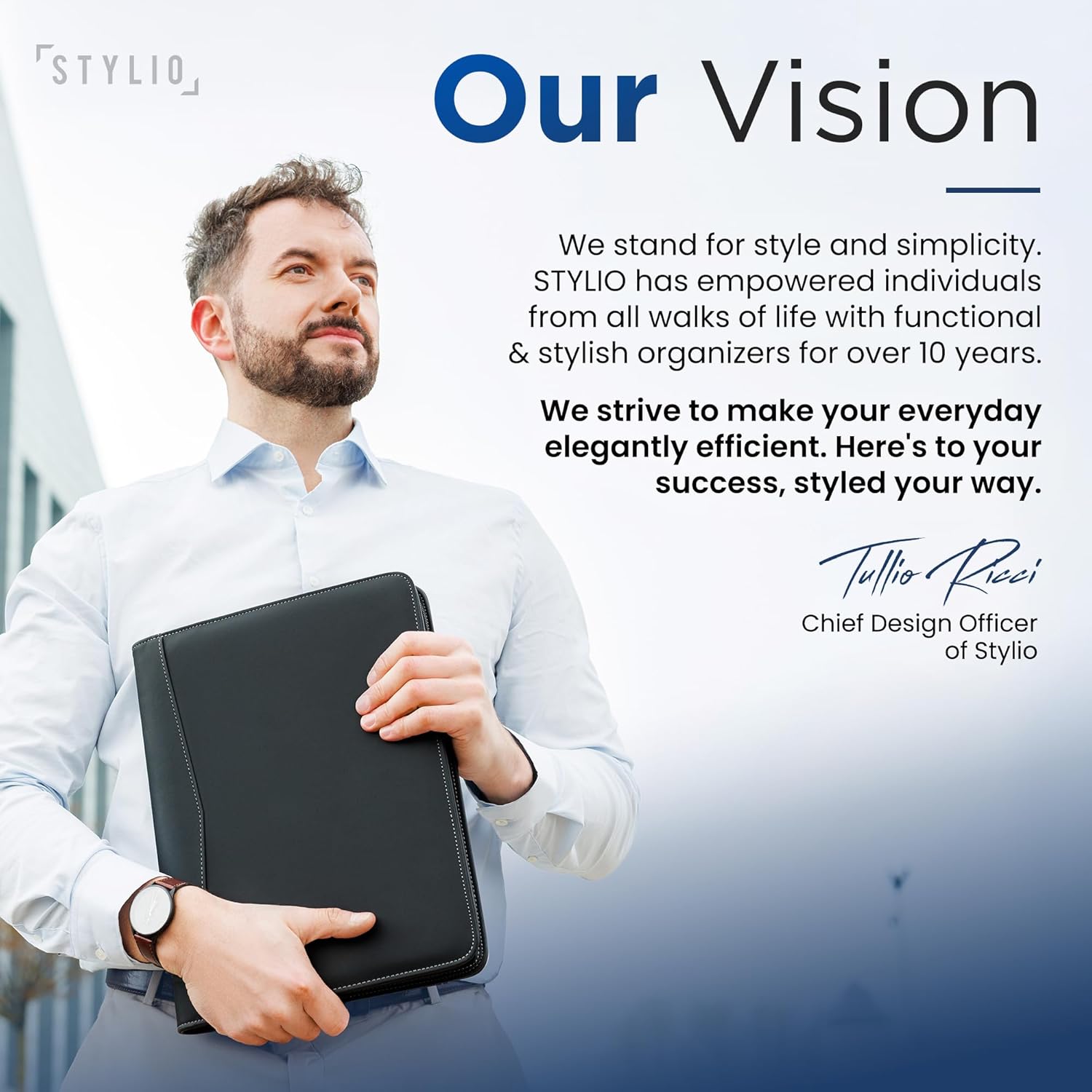 STYLIO Zipper Portfolio Binder | Padfolio 3 Ring Binder (1") and Clipboard Folio (Removable) | Portfolio Organizer for Documents, iPad, Tablet, Phone | Faux Leather Notebook for Men & Women