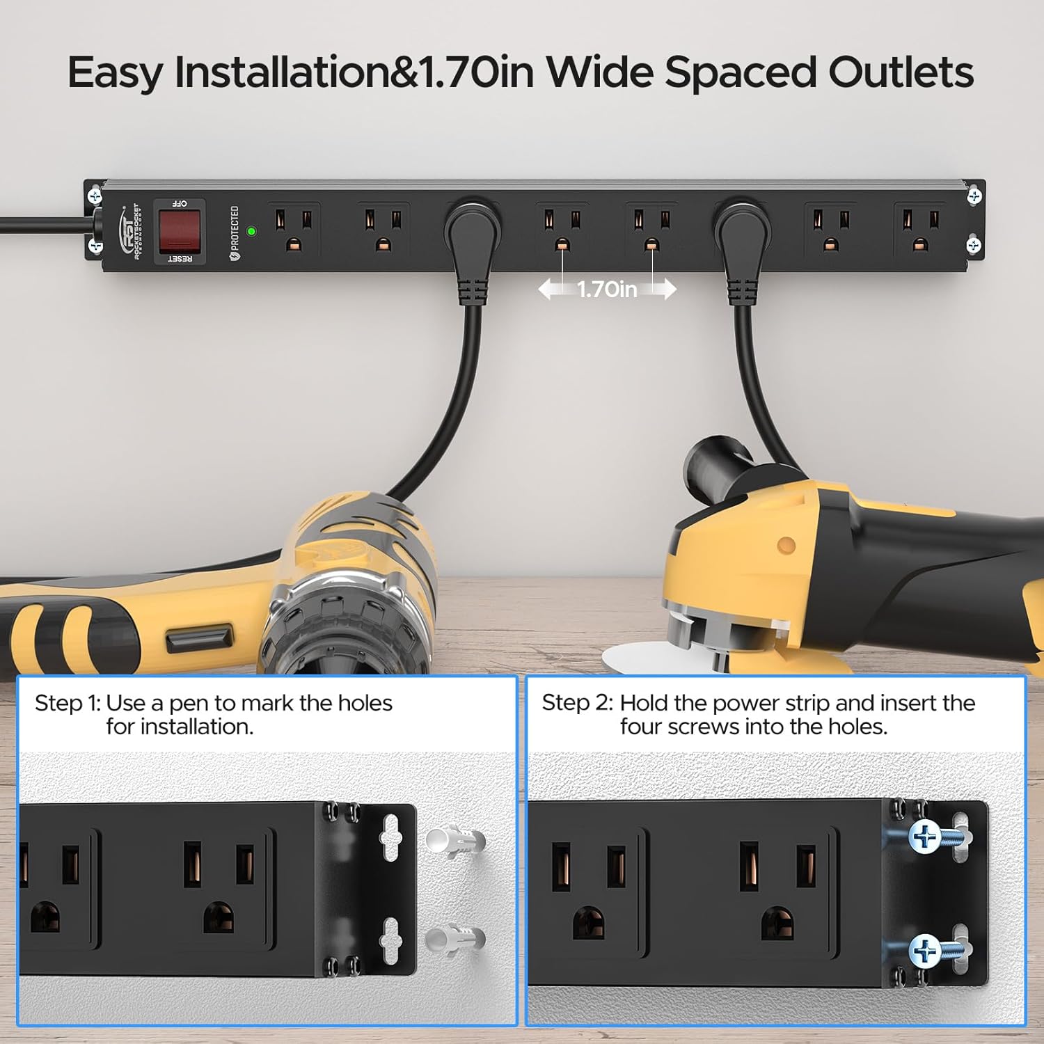 - [Humanized Design] This long power strip is designed to fit the standard 16-inch stud spacing, allowing you to easily attach it to your wall studs for a secure and organized setup. Wide-spaced 1.7-inch center-to-center outlet, perfect for bulky plugs and power supplies. 45° angled flat plug, and mounting supported hanging slots, all these features bring you more convenience.