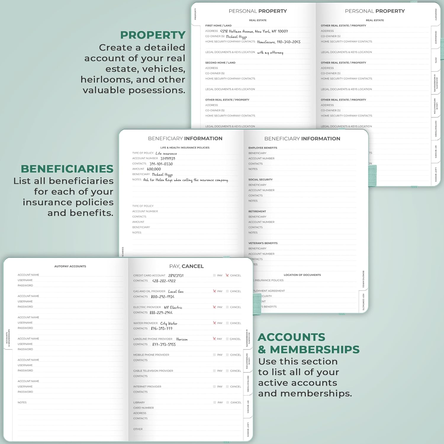 - MEDICAL & FINANCIAL INFO, INSURANCE POLICIES, ACTIVE MEMBERSHIPS & MORE: Inside this funeral planning workbook, you can add care instructions for dependents and pets, personal property, finance & business info, insurance policies, beneficiaries, and more.