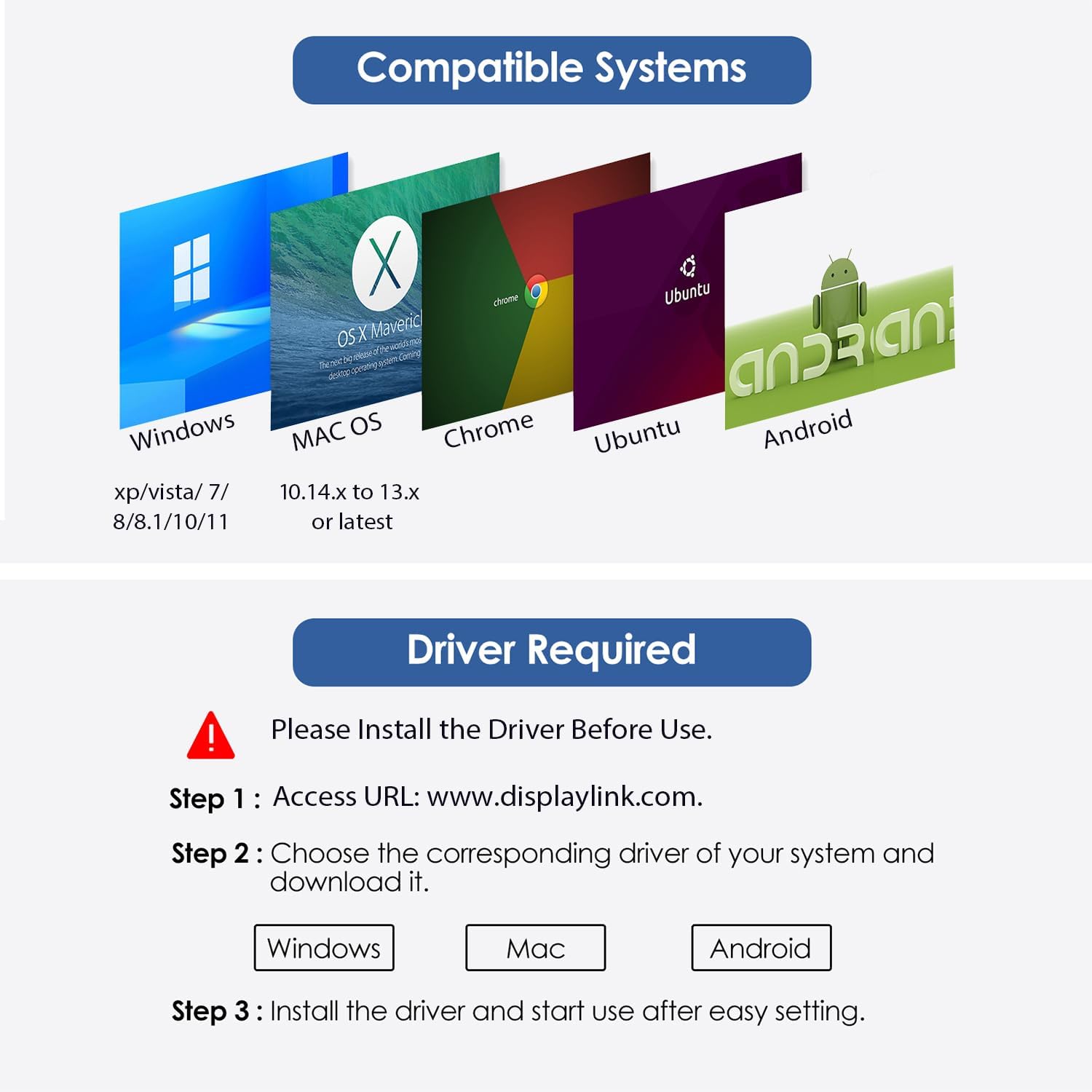 - 【Compatibility】 Windows 11/10/8.1/8/7/XP/Vista, Mac OS 10.14-13.X and latest, Chrome OS, Ubuntu, Android, Harmony OS. (updated driver from Displaylink website for Windows 10, 8.1, 8, 7. More compatibility info can be found on Displaylink website)