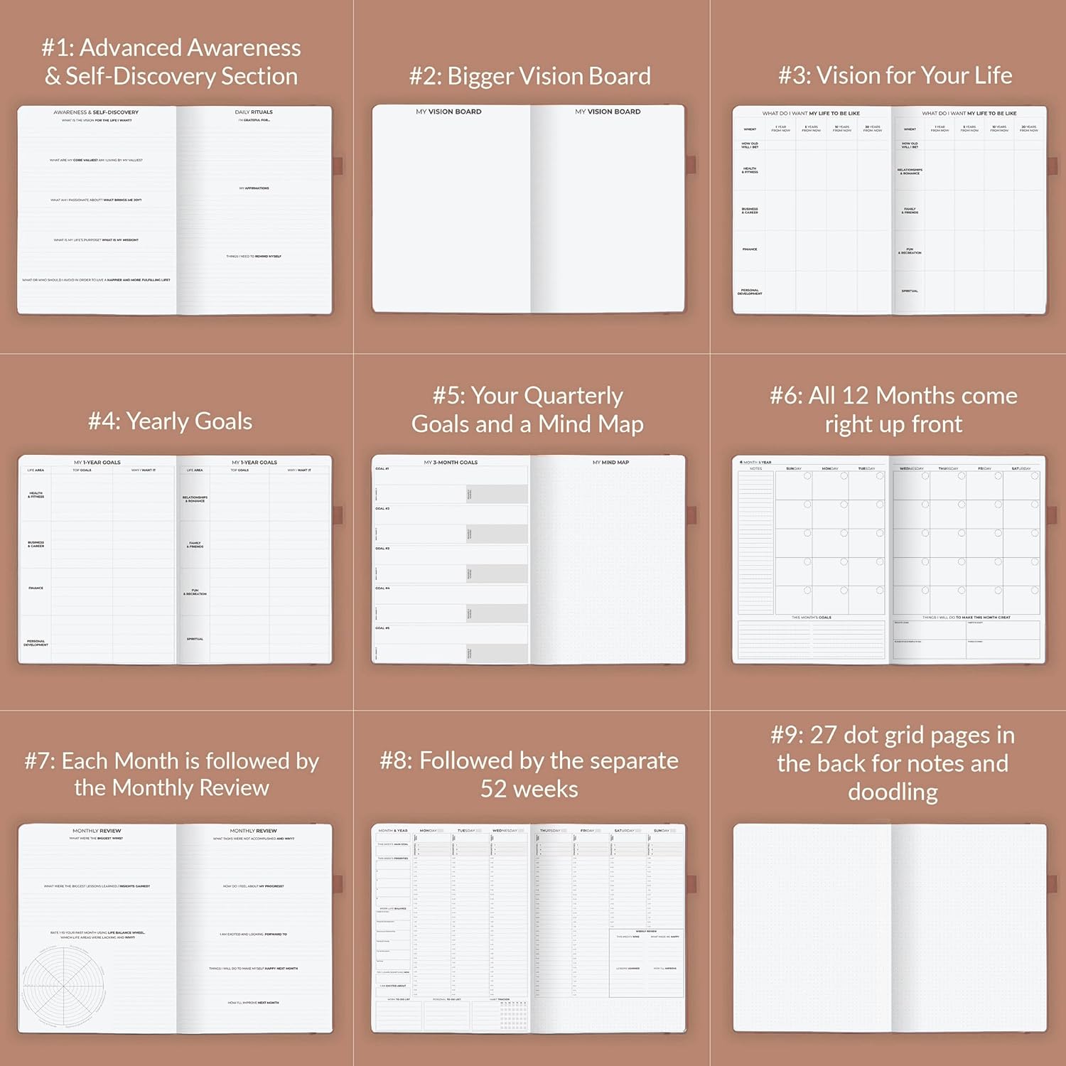 - TOP QUALITY, USER GUIDE & STICKERS - This planner and organizer for women and men comes with stickers, and user guide, an eco-leather cover, thick 120gsm paper, an elastic band, a pen loop, and lay-flat binding.