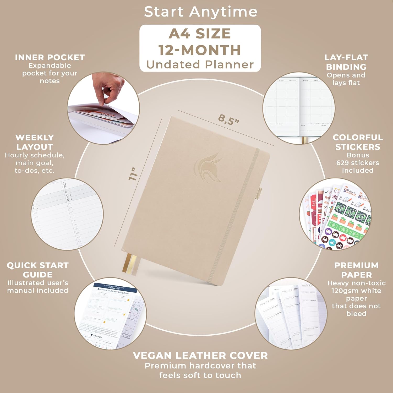 - A4 SIZE & UNDATED LAYOUTS - This calendar organizer is undated, meaning you can start anytime. It has a large A4 format – perfect if you have larger handwriting or like to plan everything in detail.