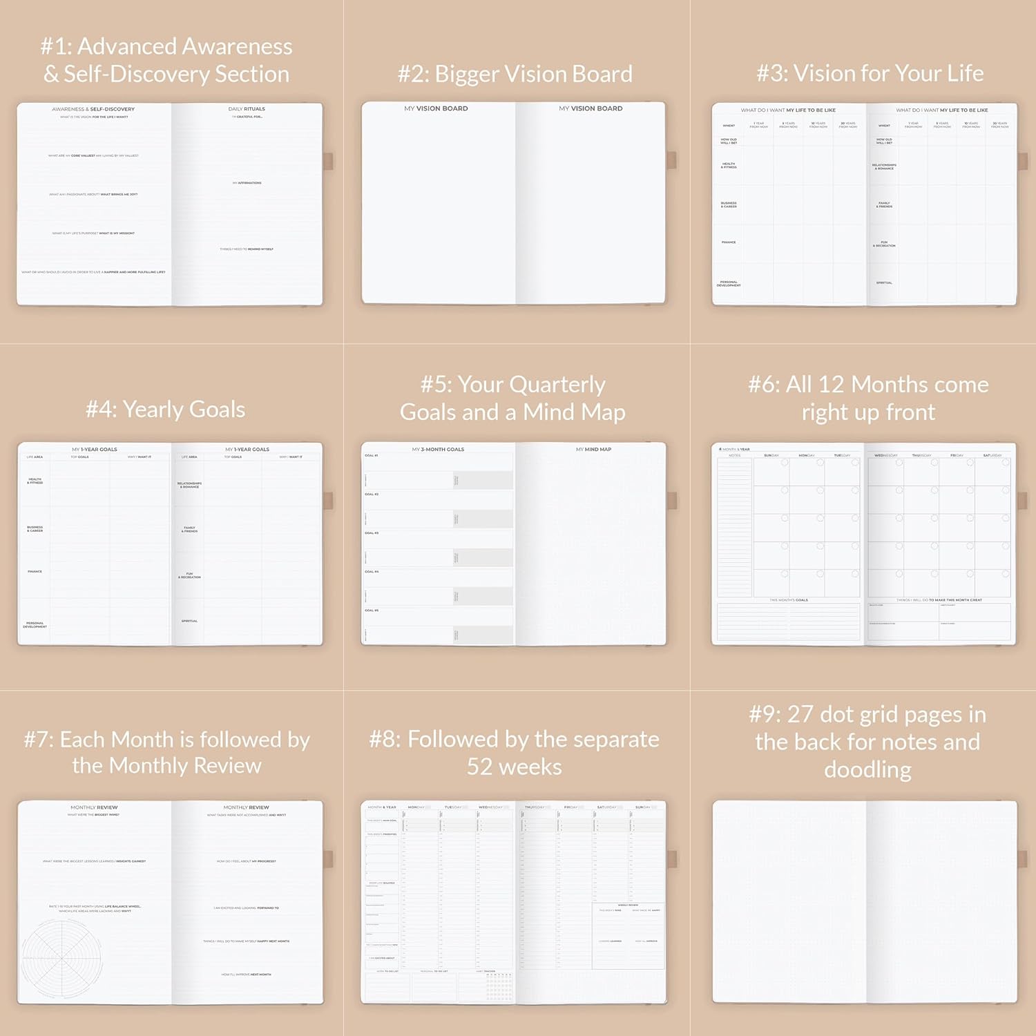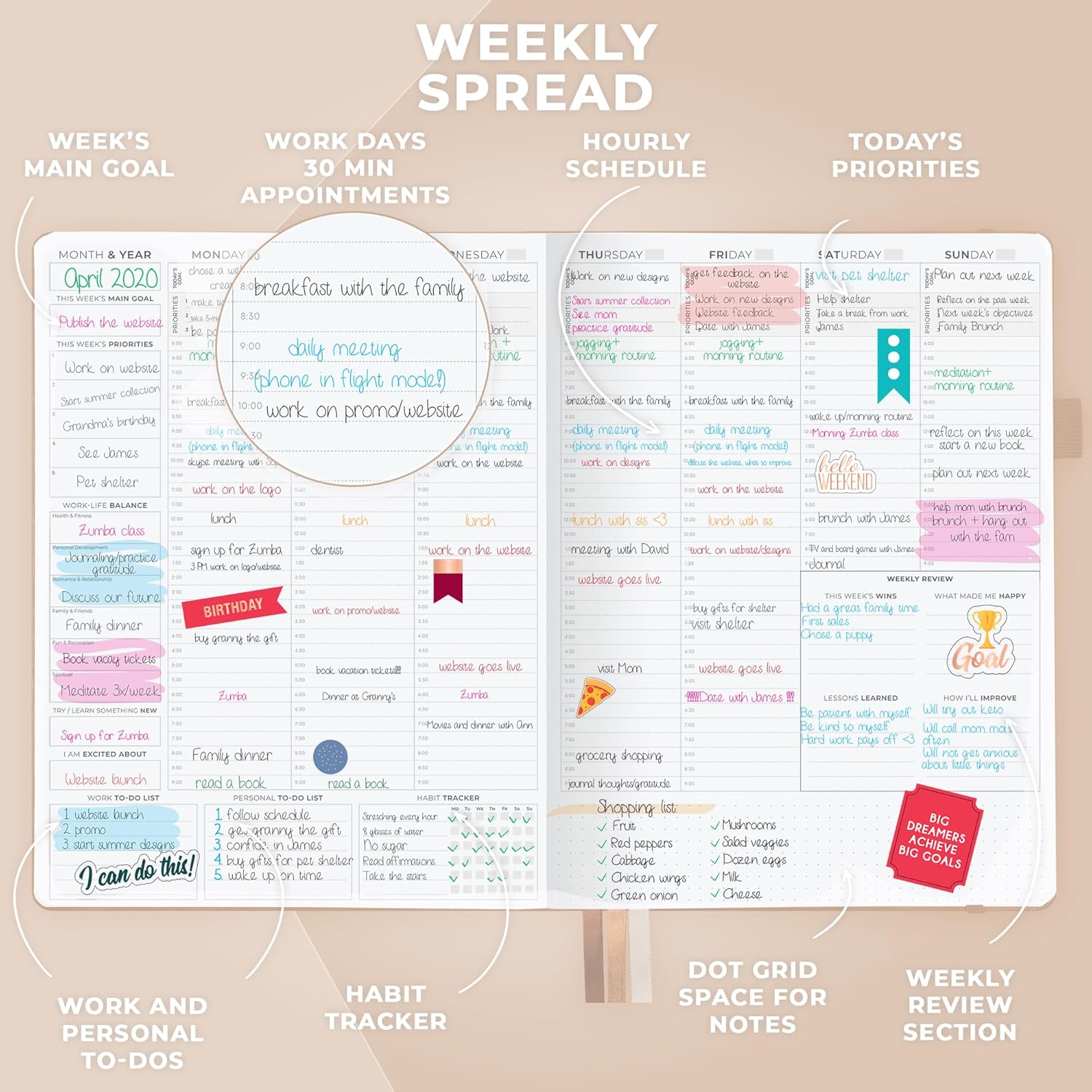 - TOP QUALITY, USER GUIDE & STICKERS - This planner and organizer for women and men comes with stickers, and user guide, an eco-leather cover, thick 120gsm paper, an elastic band, a pen loop, and lay-flat binding.