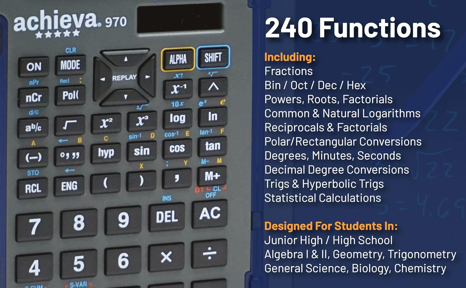 - 240 Functions: Including trigonometric functions and statistical calculations