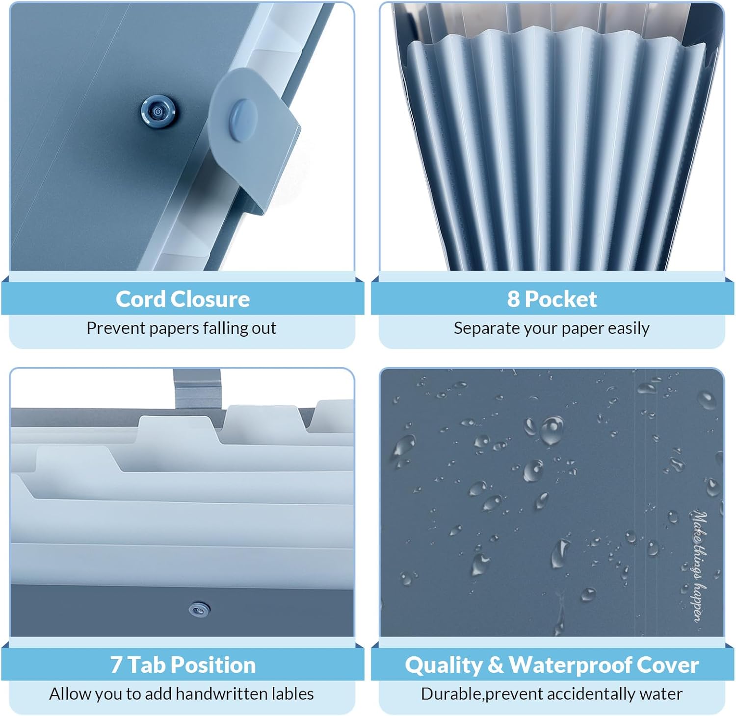 SKYDUE Expanding File Organizer with 8 Pockets, Accordion File Folders with Labels, Portable Document Paper Bill Receipt Organizer, Home College School Office Supplies, Letter Size, Blue