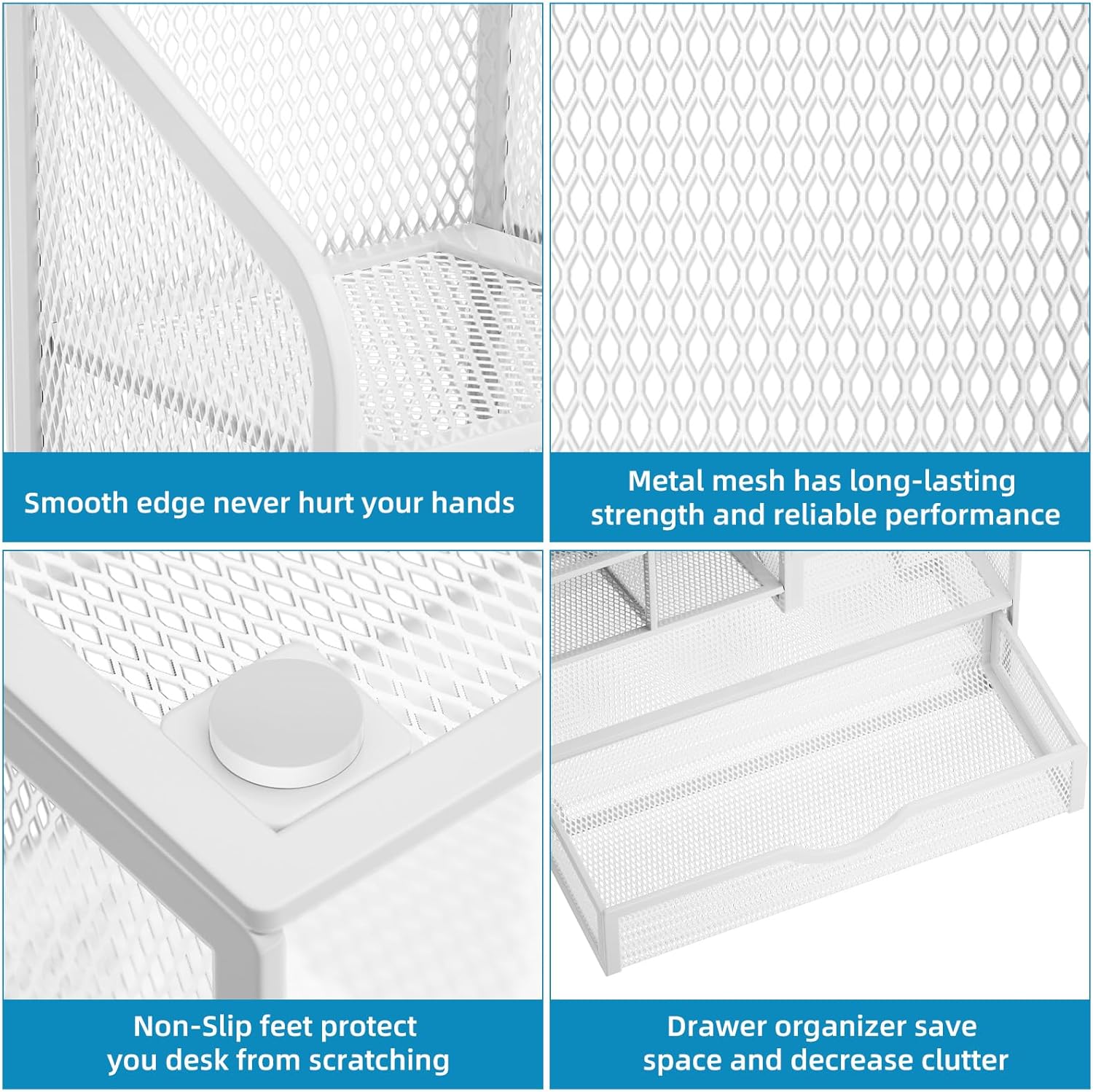 Marbrasse Mesh Pen Holder for Desk, Multi-Functional Pencil Organizer with Drawer, Desk Organizers and Accessories for Office Art Supplies (White)