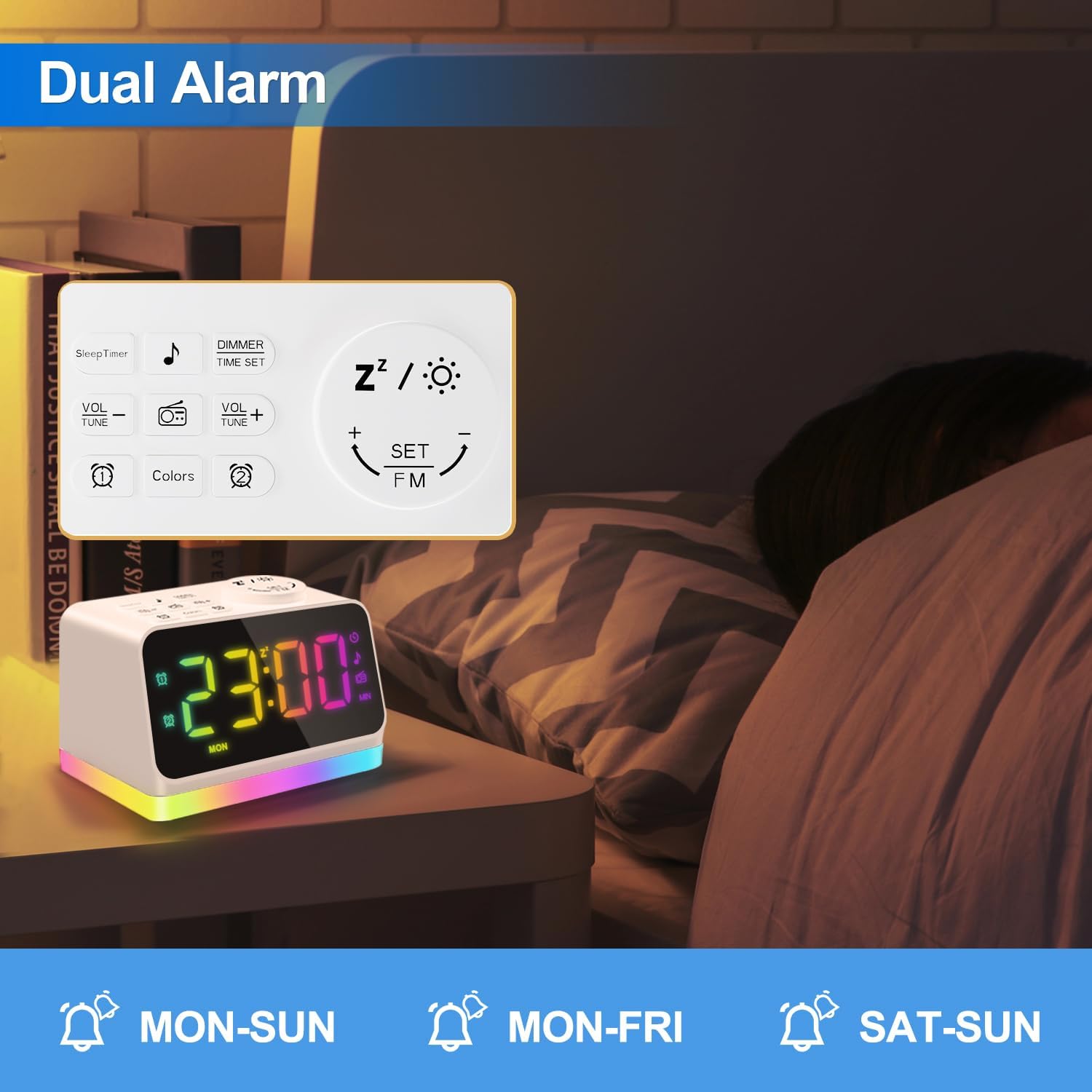 JALL Digital Alarm Clock with FM Radio for Bedroom, 8 Colors Night Light with 2 Charging Port, Sleep Sound Machines with Timer, Dual Alarm, Loud Alarm and Easy to Use for Seniors and Kids as Gift