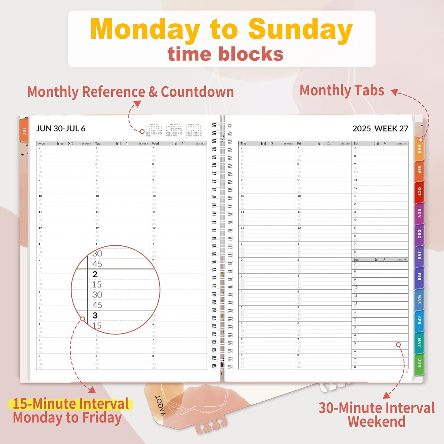 • Weekly View: 2-page weekly layout from Monday to Sunday, 15-minute time slots in increments from 7:00 a.m. to 8:45 p.m. on weekdays, and 7:00 a.m. to 8:30 p.m. on weekends, 3-month reference previews, allowing you to manage time and track appointments easily.