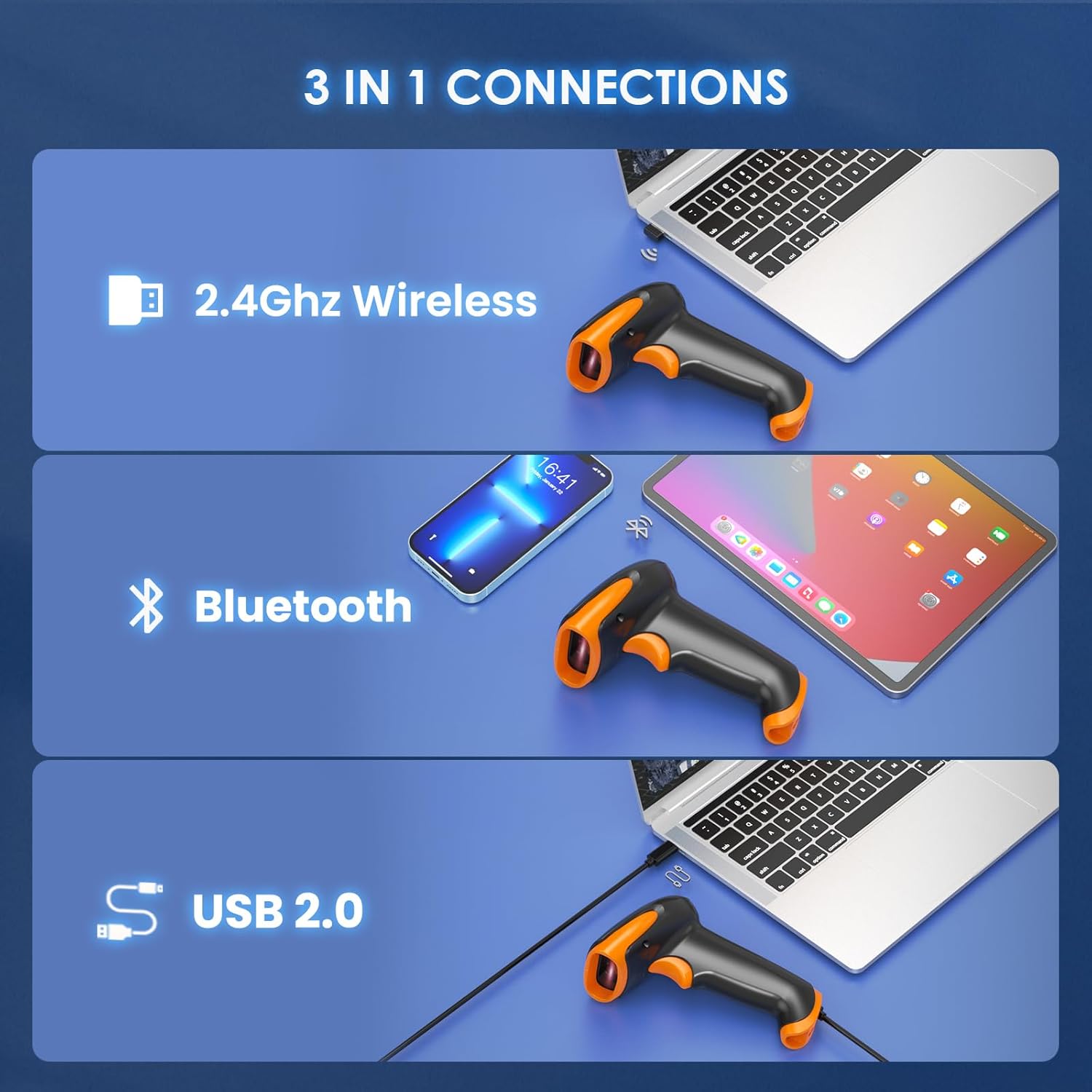 - Wireless&Bluetooth&USB: To create the best scanning experience, we boldly combine 3 connections in use. Compatible with 2.4G Wireless connection receiver; Bluetooth Function; and Wired USB connection. Easily connected with your laptop, PC, mobile phone, tablet, iPhone, iPad, and POS. Work with Windows XP/7/8/10, Mac OS, Windows Mobile, Android OS, iOS