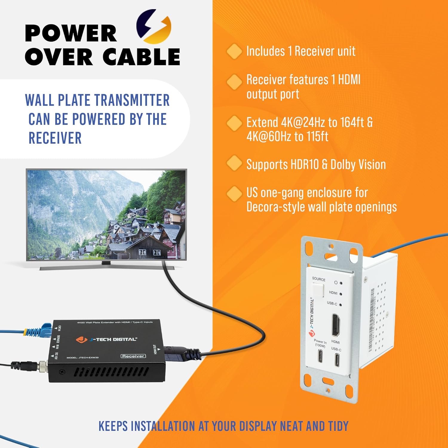 J-Tech Digital 4K HDMI & USB C Extender Over Single Cat5 5e 6 7 Cable, Up to 164ft Wall Plate Over Ethernet HDR Dolby Vision USB-C Charging Port, PoC, IR, Auto-Switch [JTECH-EXW30]