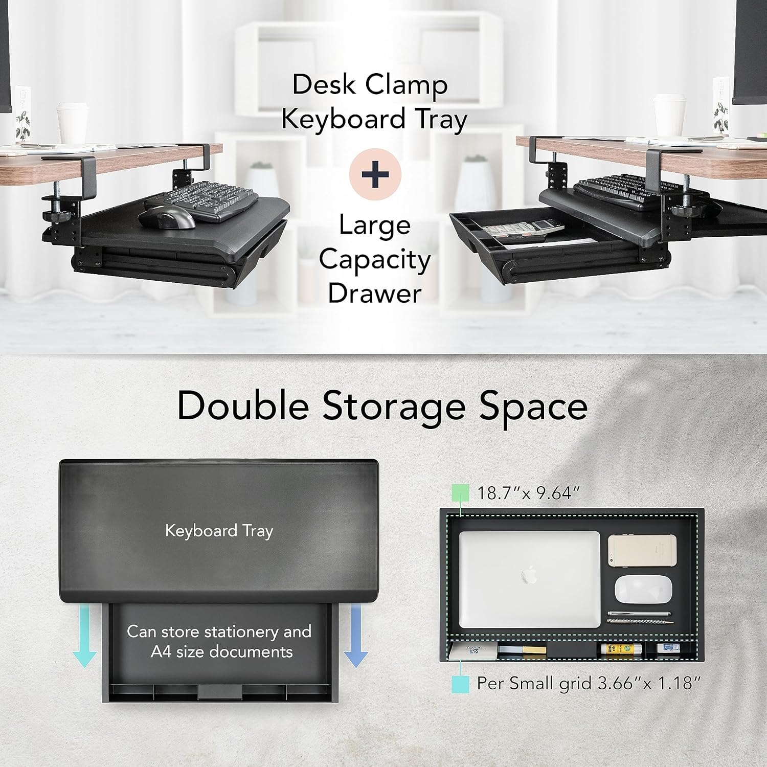 - 【LARGE PLATFORM SIZE】With a platform size of ABS Plastic L27.56 x W12.2 inches and a drawer size of L20 x W12.2 x H2.16 inches, the tray provides ample space for your keyboard and mouse, as well as other office supplies