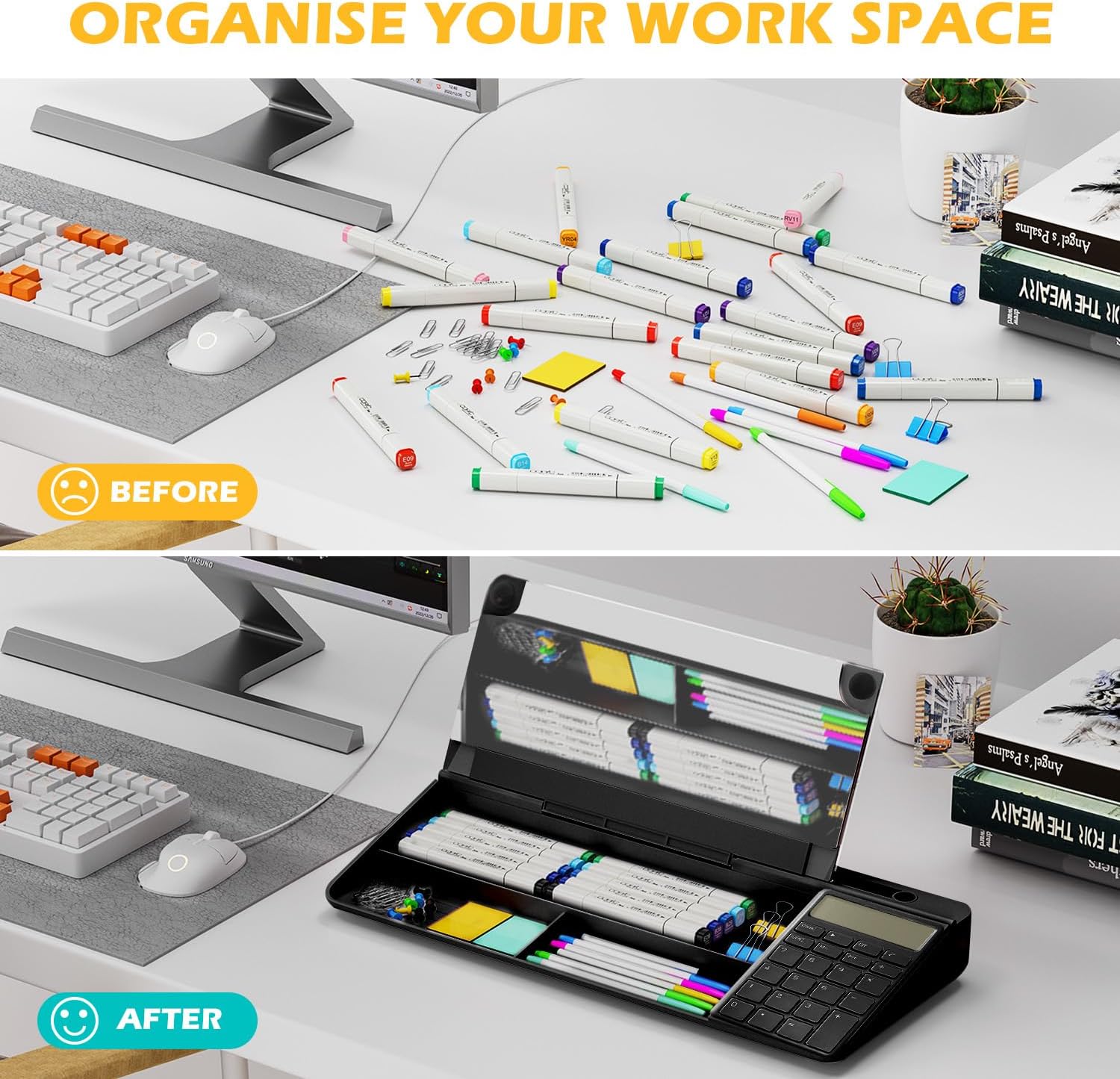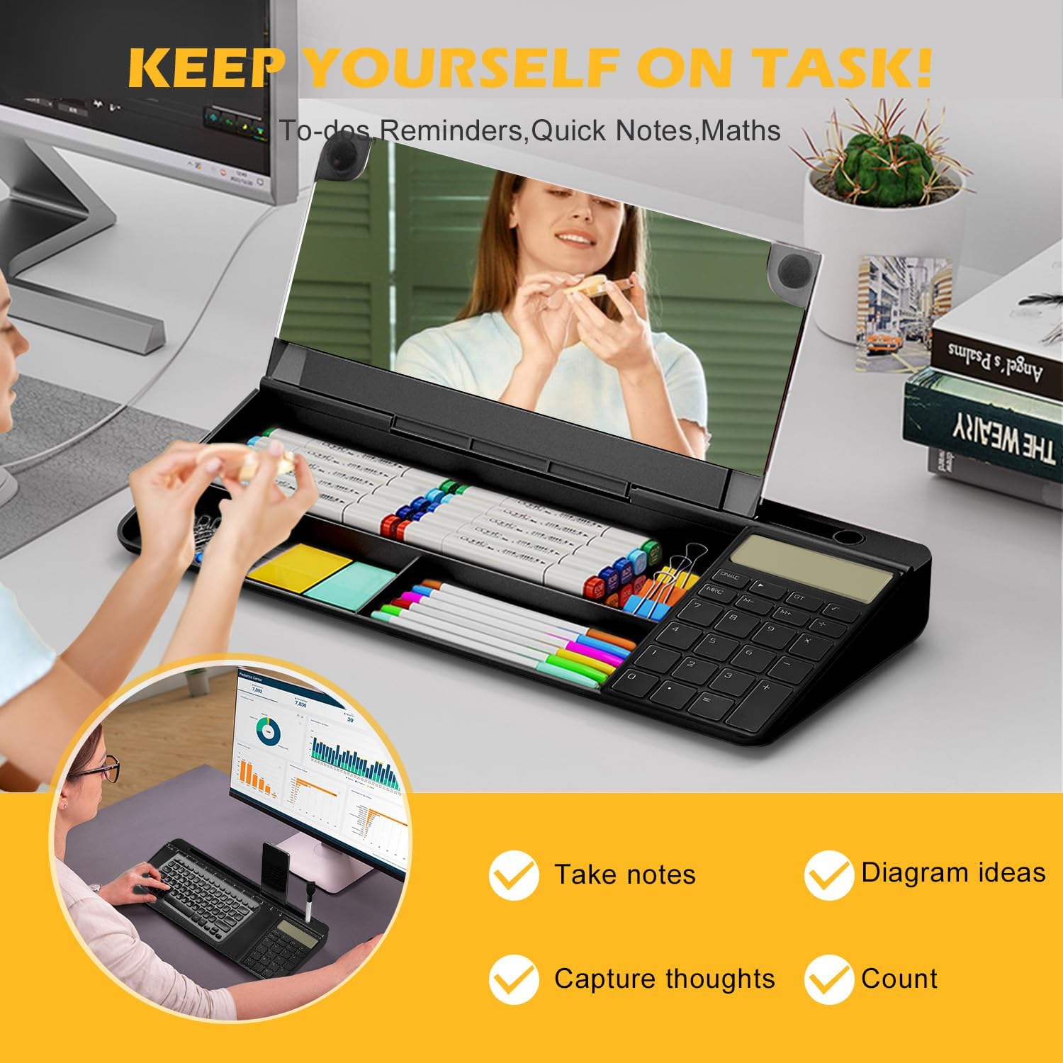 - ✅【MULTIFUNCTIONAL DESKTOP BOARD】:Our modern desktop gadget combines writing, organizer, built-in mirror, calculation and ruler as one, which can be used as a notepad, desktop organizer, calculator, ipad/pen/cell phone holder or computer pad keyboard holder. Our desktop whiteboard is a multifunctional office partner that can meet all your office needs. Try it out!