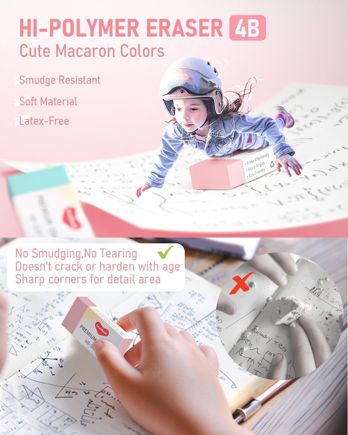 - Soft Latex-Free Erasers - Includes 3 pastel 4B erasers that erase cleanly without smudging or tearing paper, safe for all ages. The 18 small eraser refills ensure you're never without a backup for precise corrections
