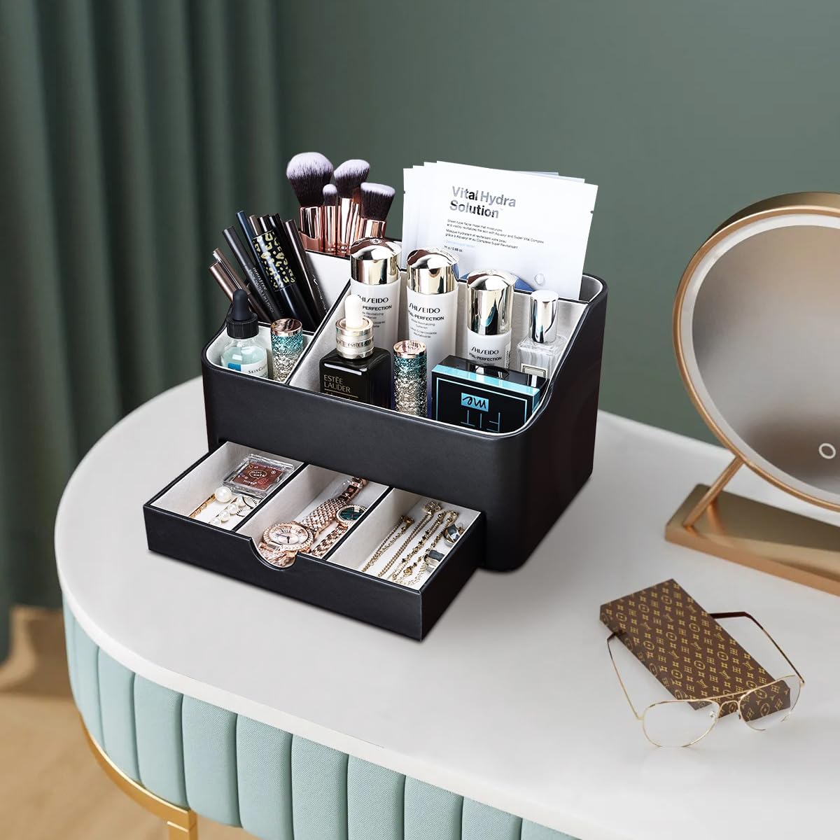 KINGFOM Desk Organizer with Drawer, Multifunction Pencil Holder for Desk, Desk Organizer and Accessories 5 Comparetments for Home Office Supplies (Black)