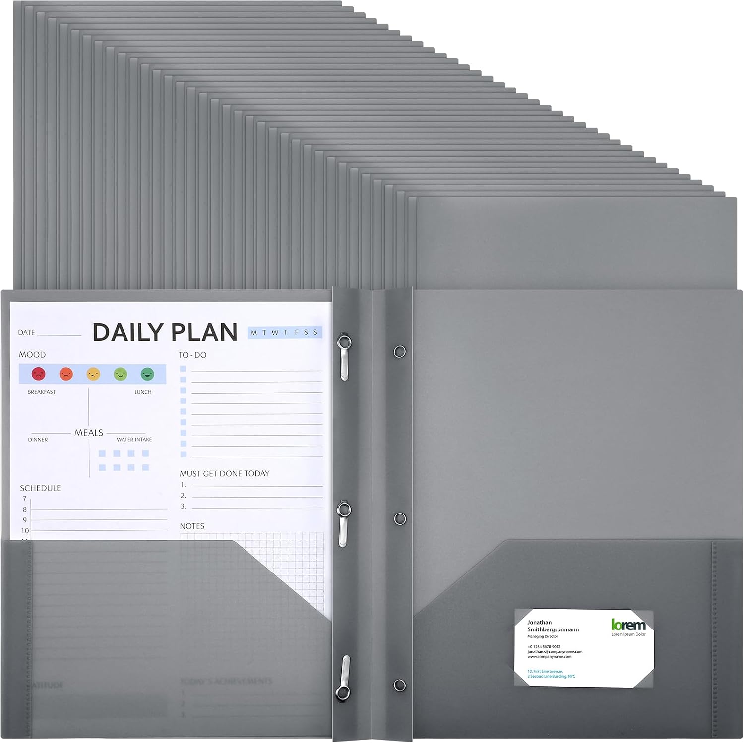 Patelai 48 Pcs Plastic Folders with 2 Pockets and 3 Prongs Home Folders with Card Slot Letter Size Heavy Duty Report Covers for Back to School(Gray,Classic)