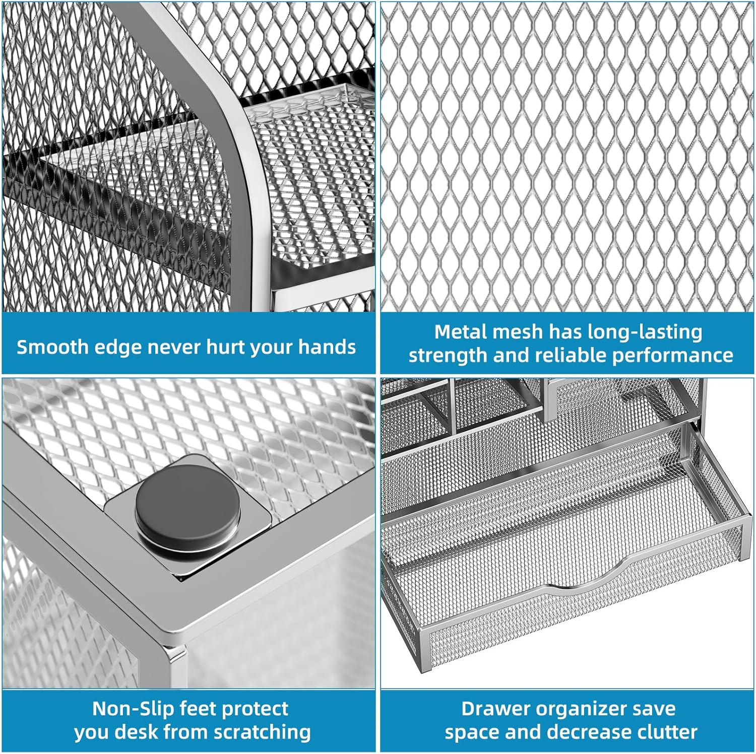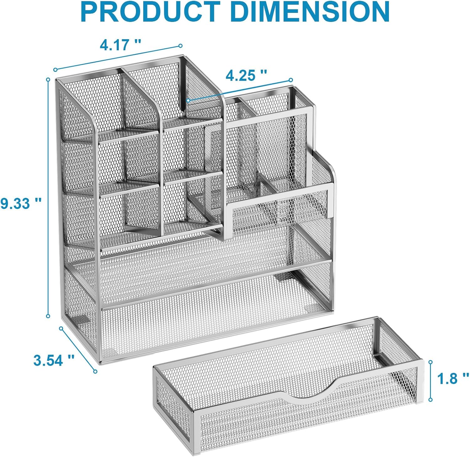Marbrasse Mesh Pen Holder for Desk, Pen Organizer with Drawer, Multi-Functional Pencil Organizer, Desk Organizers and Accessories for Office Art Supplies (Silver)