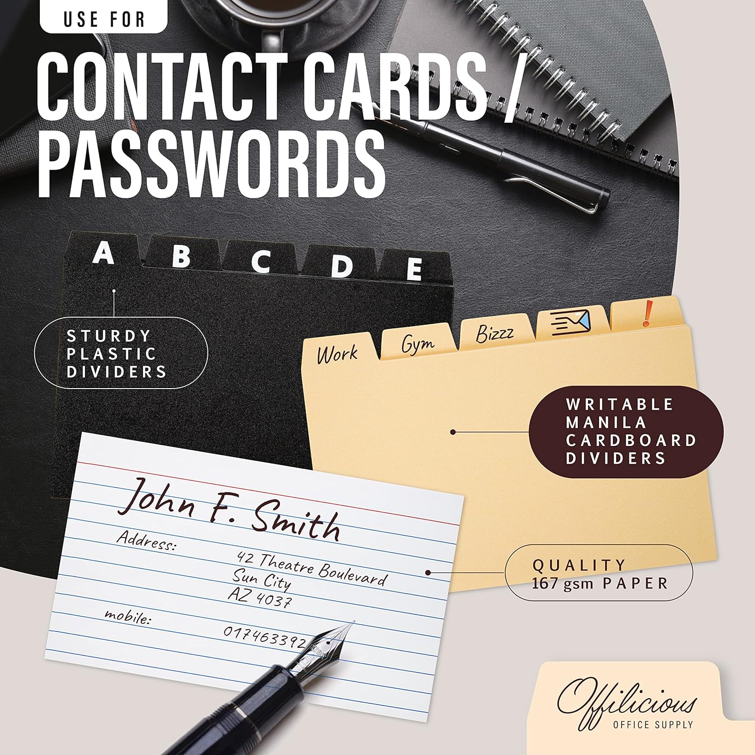 - AT OFFILICIOUS, WE’RE COMMITTED to providing the most DURABLE, QUALITY-CRAFTED office organizer supplies. Our index card case with dividers is made with THE BEST MATERIALS and constructed with care, for TASTEFULLY DESIGNED, dependable 4x6 card holder you’ll love for YOUR OFFICE & HOME. If for any reason you aren’t satisfied with your business card holder organizer, we’re standing by to help.