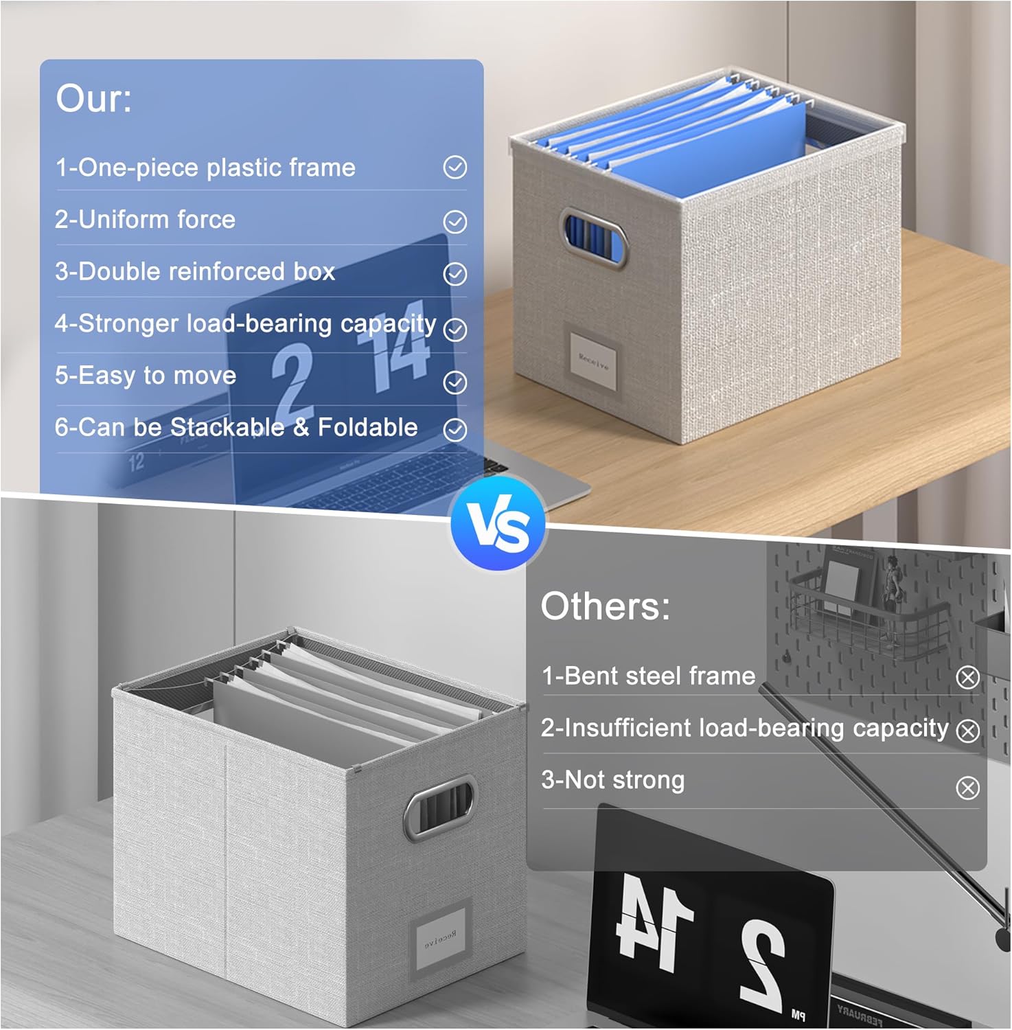- [Upgraded File Hanging System] - Different from other file box hanging systems, Our file box hanging has been improved and upgraded. You only need to put the one-piece plastic frame slides on the top of the file box easily. After completion, The file box hanging systems has a greater load-bearing capacity, you can not only slide the hanging file back and forth smoothly, but also further strengthen the file box to prevent the box from shaking.