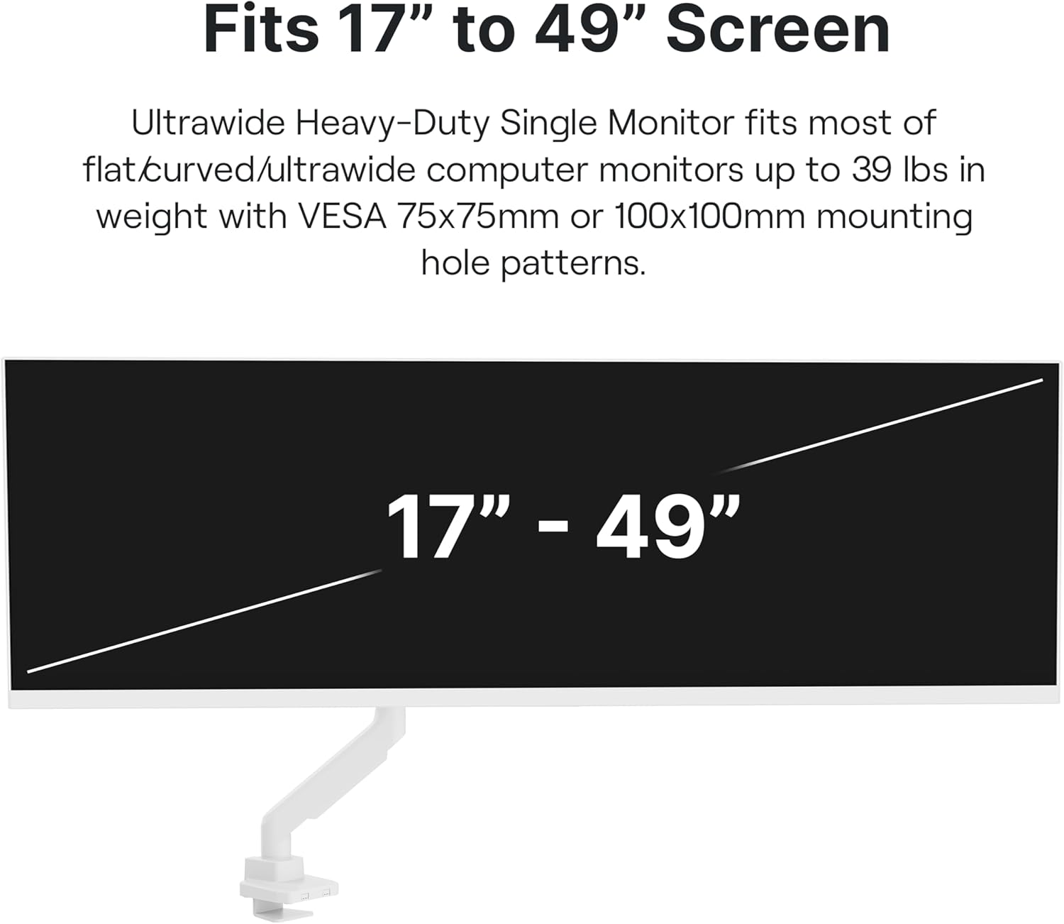 - Fits 17" to 49" screens: this heavy-duty monitor arm is designed to hold a flat monitor with a panel size of 17 to 49 inches with a weight capacity of up to 39.6 pounds for flat monitors and 30.8 pounds for curved monitors. This monitor arm also uses a 75x75mm or 100x100mm VESA plate for wide compatibility.