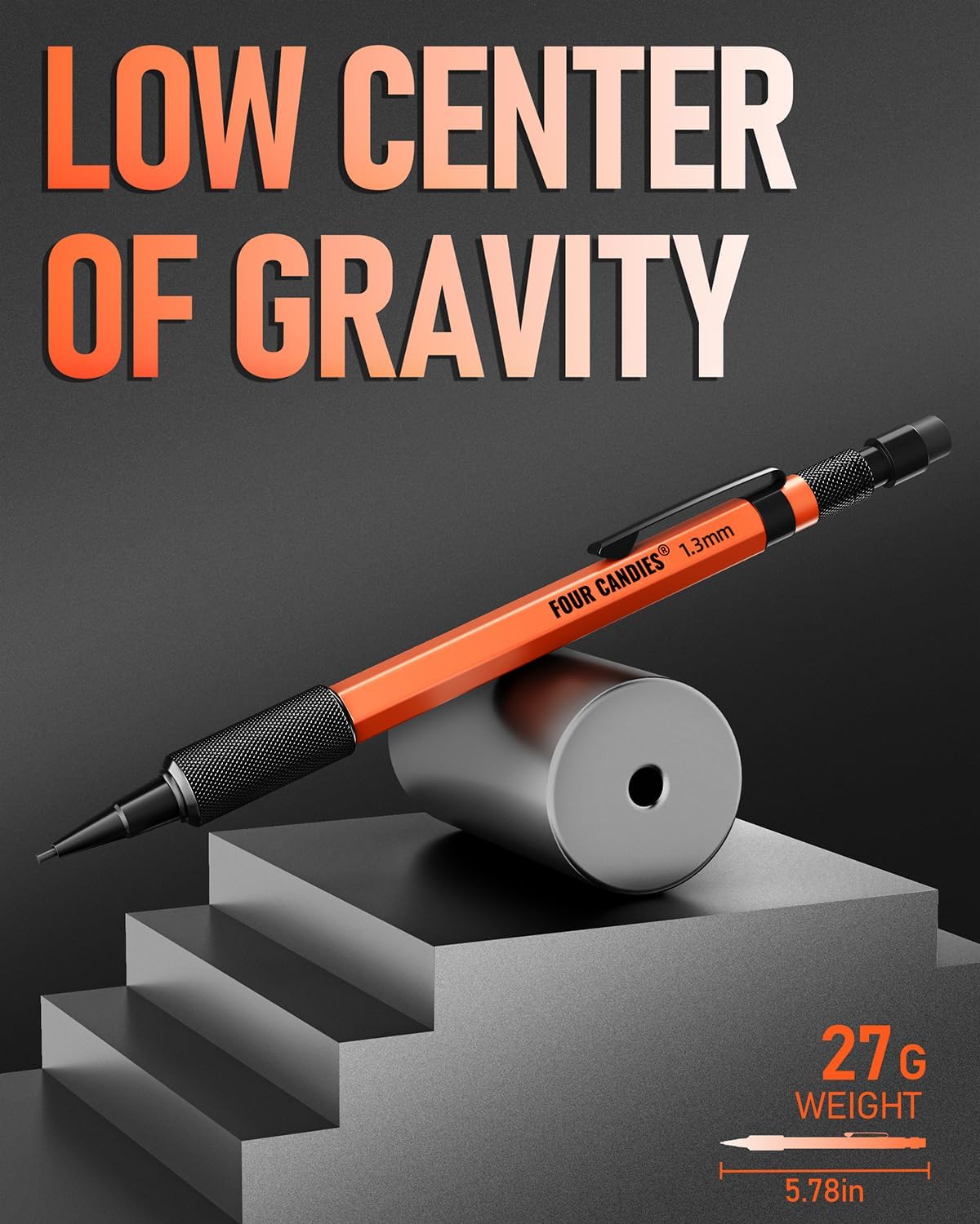 Four Candies 1.3mm Mechanical Pencil Set with 24 Lead Refills, Metal Weatherproof Heavy Duty Outdoor Carpenter Pencil, Eraser, 6 Eraser Refills for Architect Drafting Woodworking Marking with Case