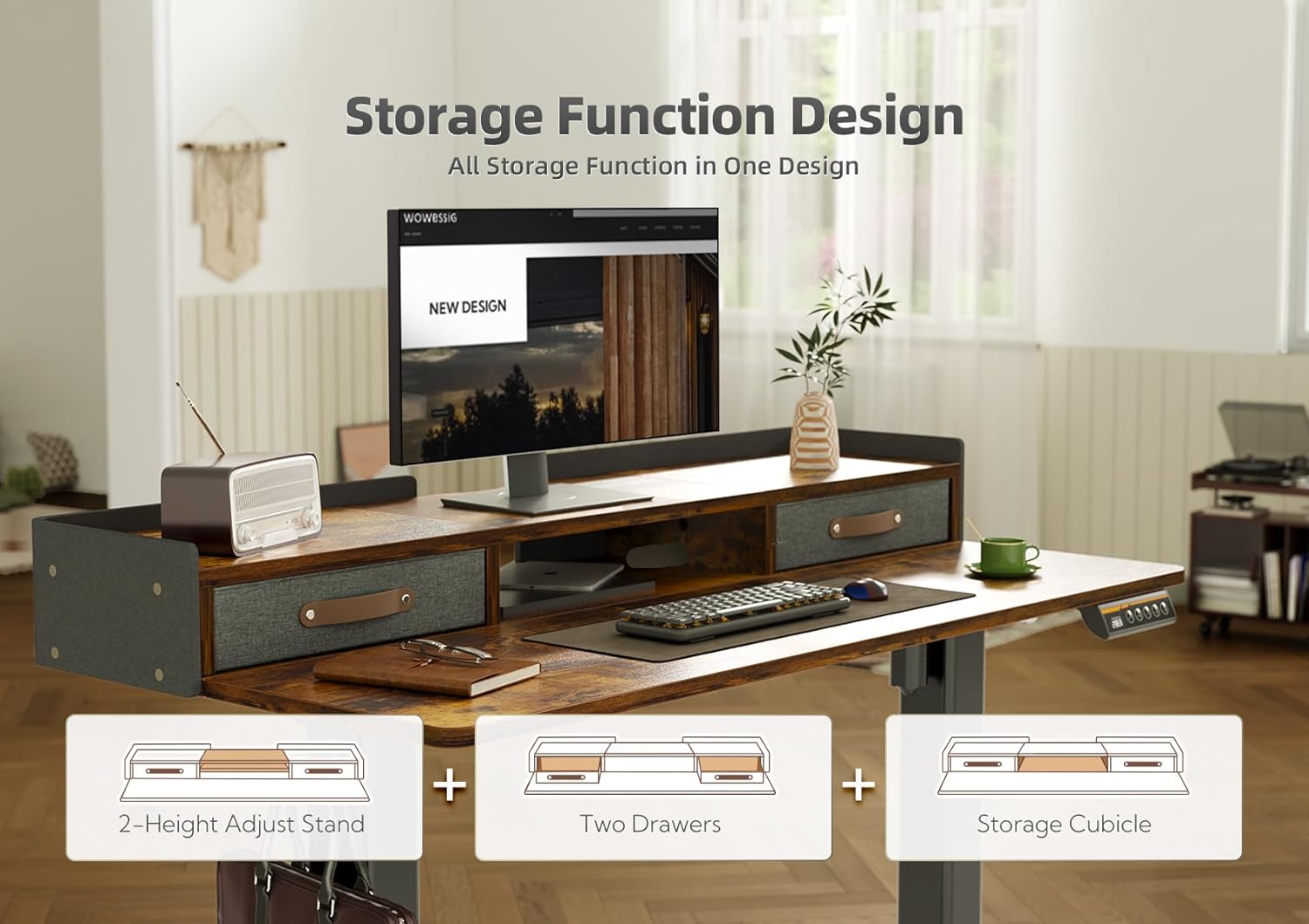- 2-Drawers for Storage - Adjustable stand desk with drawers. 2 tabletop drawers provide more storage & organize space for a variety of home office tasks. The desk comes with a hook, drawers, and felt fence, which provides more home office desk usage possibilities.