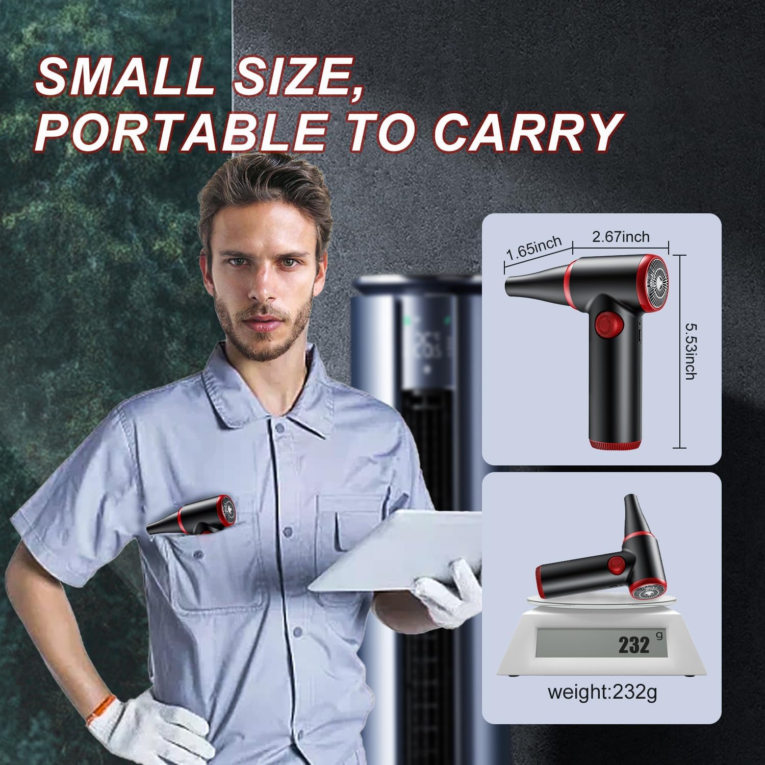 - Electric Air Duster 【Compact design】The Cordless Air Duster has a metal-coated appearance and a compact design. It is not only beautiful but also comfortable to hold. The size is: 2.67 in * 5.53 in * 1.65 in. It weighs only 232g and is only the size of a palm. It can be easily put into your pocket and can be taken with you to clean dust and debris anytime and anywhere.
