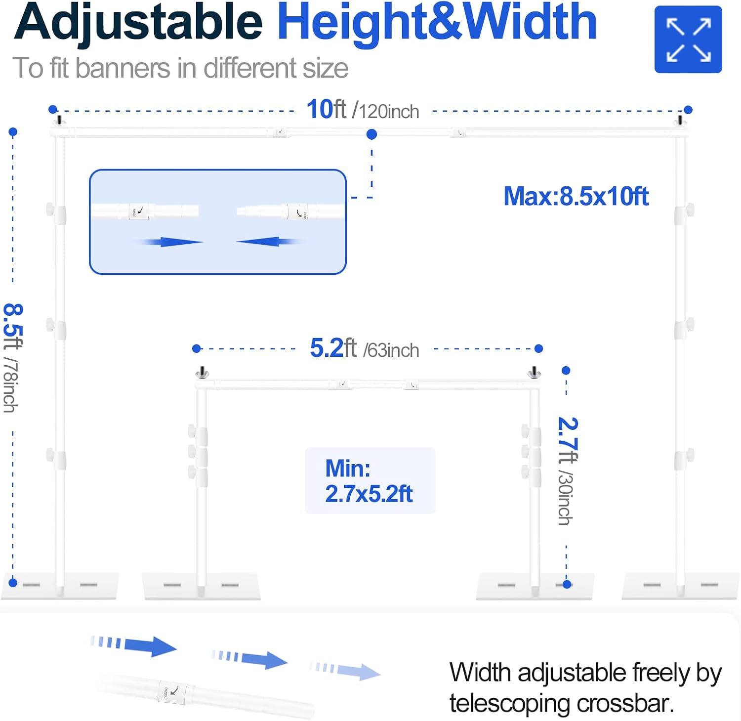 - 【Retractable Crossbar】 The telescopic design is adopted to make the width of the cross bar easily adjustable. The minimum width is 63inch/5.2ft, and the maximum width is 120inch/10ft. It can adapt to backdrops of different sizes. Refer to the product manual for specific dimensions and installation.