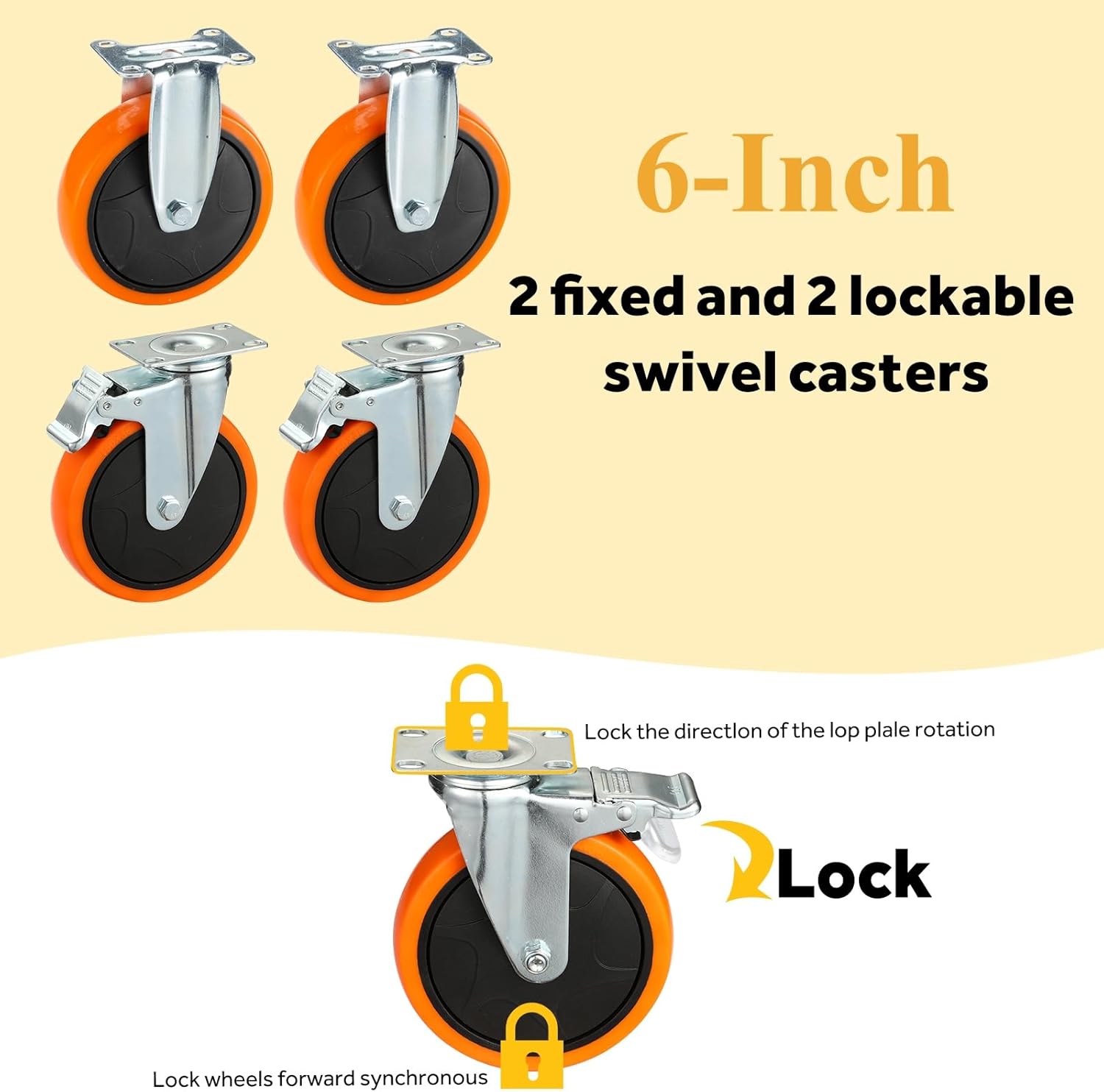 - ๐ PROFESSIONALLY DESIGNED WHEELS: 2 fixed and 2 swivel 6-inch wheels (2 with Brake) are made of industrial-strength polypropylene and non-marking polyurethane (PU) rubber. The swivel wheels can easily rotate 360 degrees flexibly, and the inner double ball bearings make the rotation and rolling more effortless and labor-saving. The locking mechanism synchronously locks the rotation and the wheel frame, thus achieving effective and fast braking.