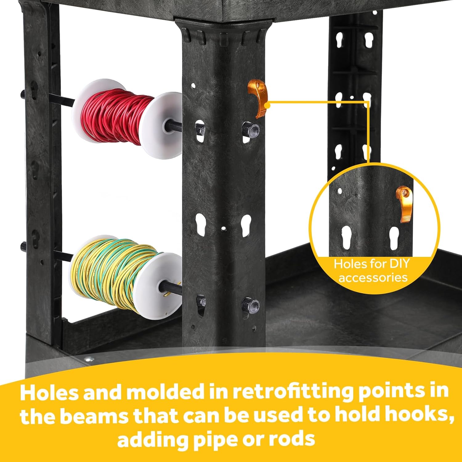 - ๐ ERGONOMIC HANDLE AND CUSTOMIZABLE FITTINGS: Our service cart ergonomic push handle is molded into top shelf with a built-in storage compartment, which provides optimum hand placement and pushing height to improve control & worker safety. Molded In Retrofitting Points in beams allow you to add pipe or rods to hold wire spools and other roll type goods.