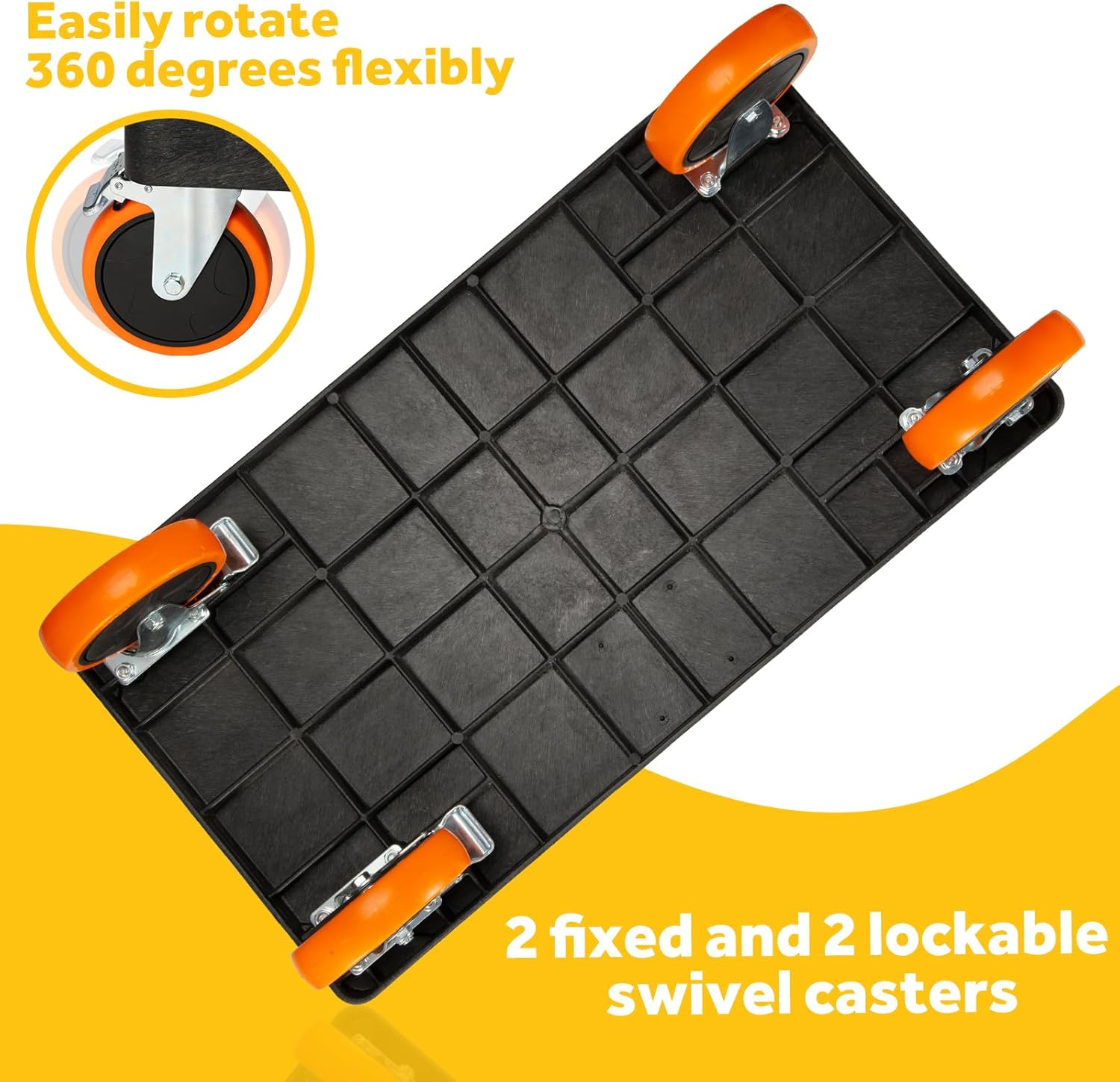- ๐ EASY MANEUVER & LOCKING BRAKES: Designed with two fixed and two lockable swivel wheels, offers a superior mix of stability and flexibility. The fixed wheels ensure steady straight-line movement, while the lockable swivel wheels provide agile navigation and secure positioning when needed. This combination makes it ideal for effortlessly transporting items with precision and ease, without the need for constant adjustment. Durable and floor-friendly, it's a practical solution for carrying loads efficiently in any setting.