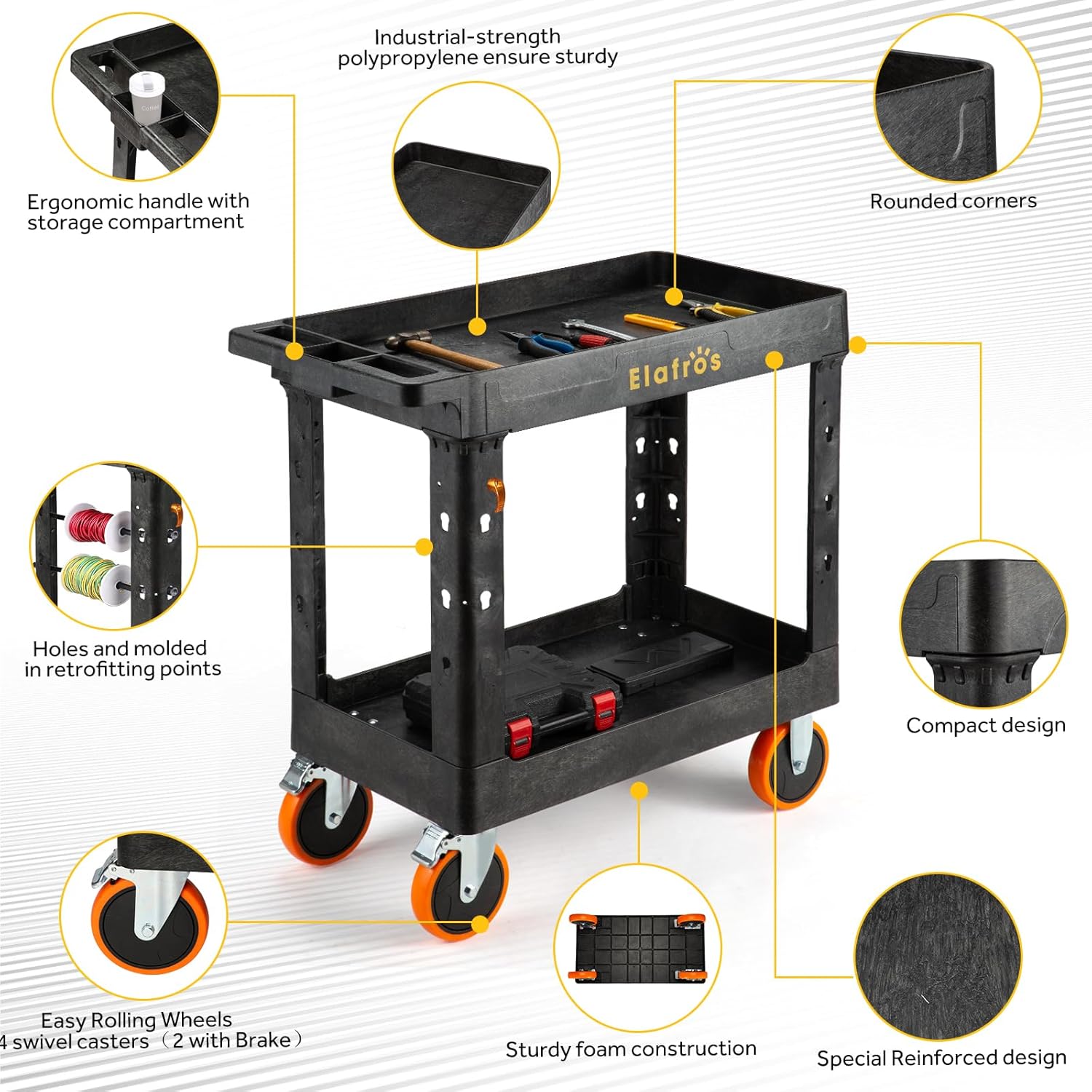 ELAFROS 2-Tier Heavy Duty Plastic Utility Cart, 34" x 17", Work Cart with Tub Storage, Deep Shelves, 2 Fixed 2 Swivel Wheels, Holds up to 550 lbs, 6" Casters, Service Cart for Warehouse